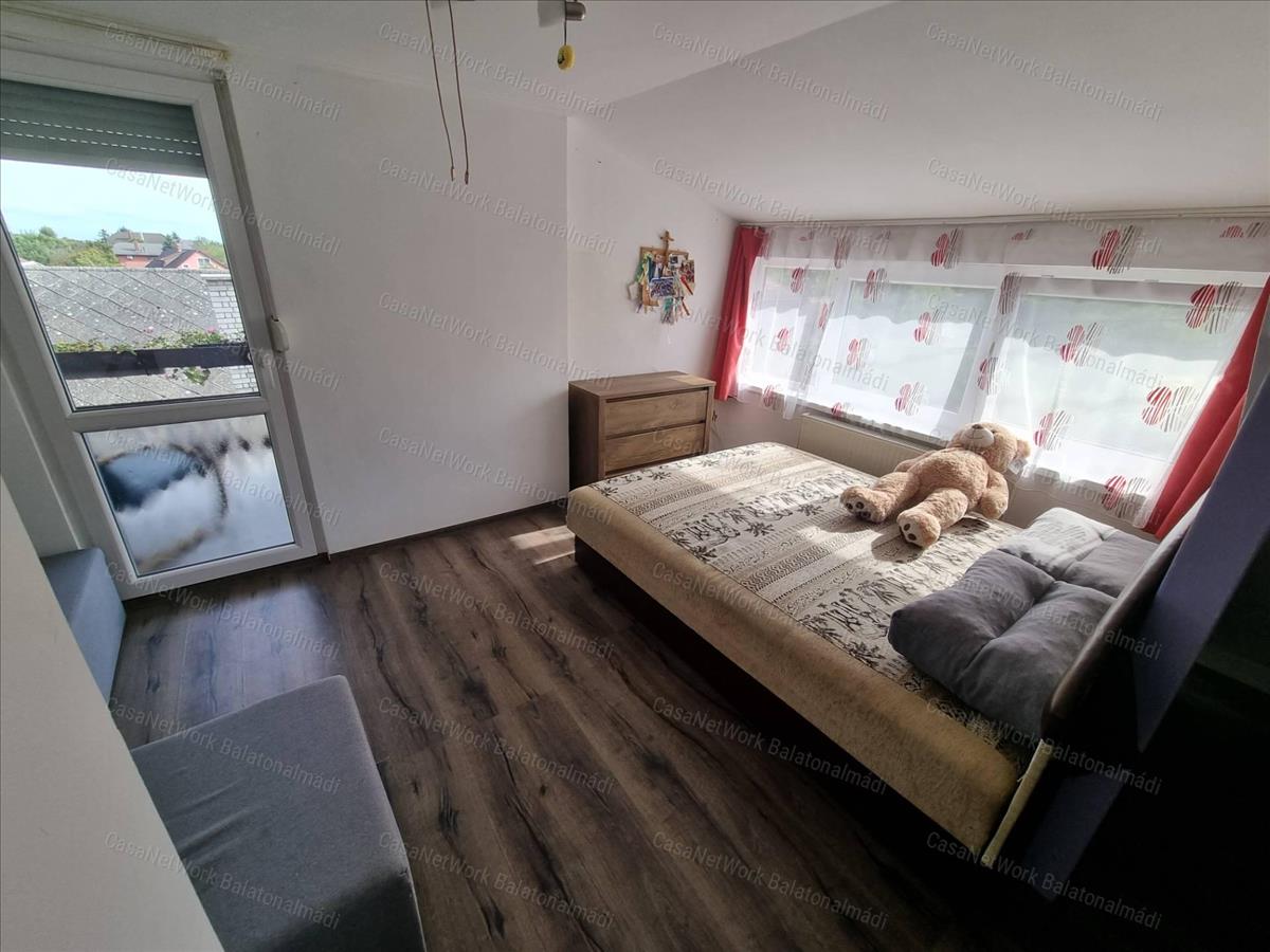 - praktikus elrendezés: nagyméretű, napfényes nappali konyhával és fürdőszoba a földszinten; az emeletre belső lépcső vezet, itt egy közlekedőt, kettő hálószobát és egy erkélyt találunk, balatoni rálátással