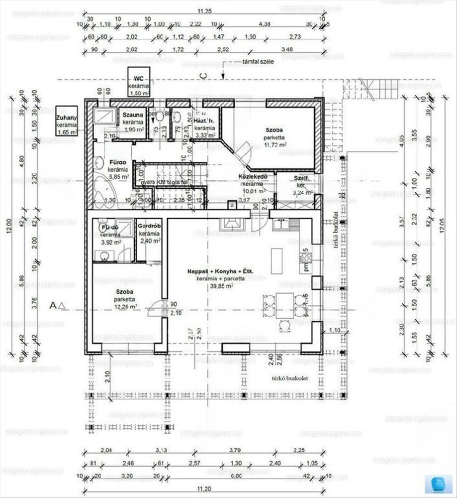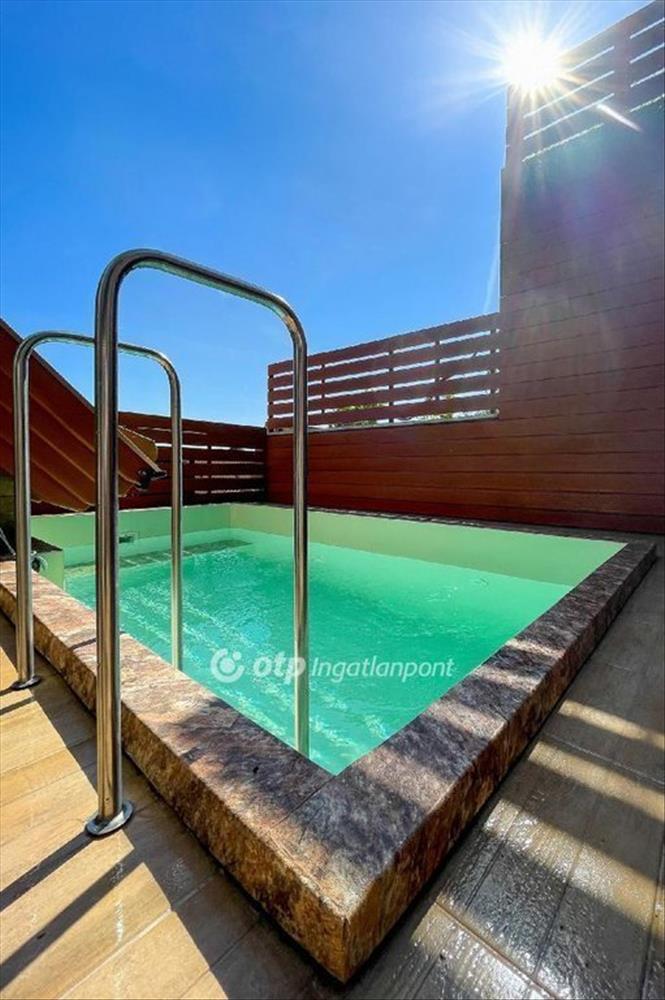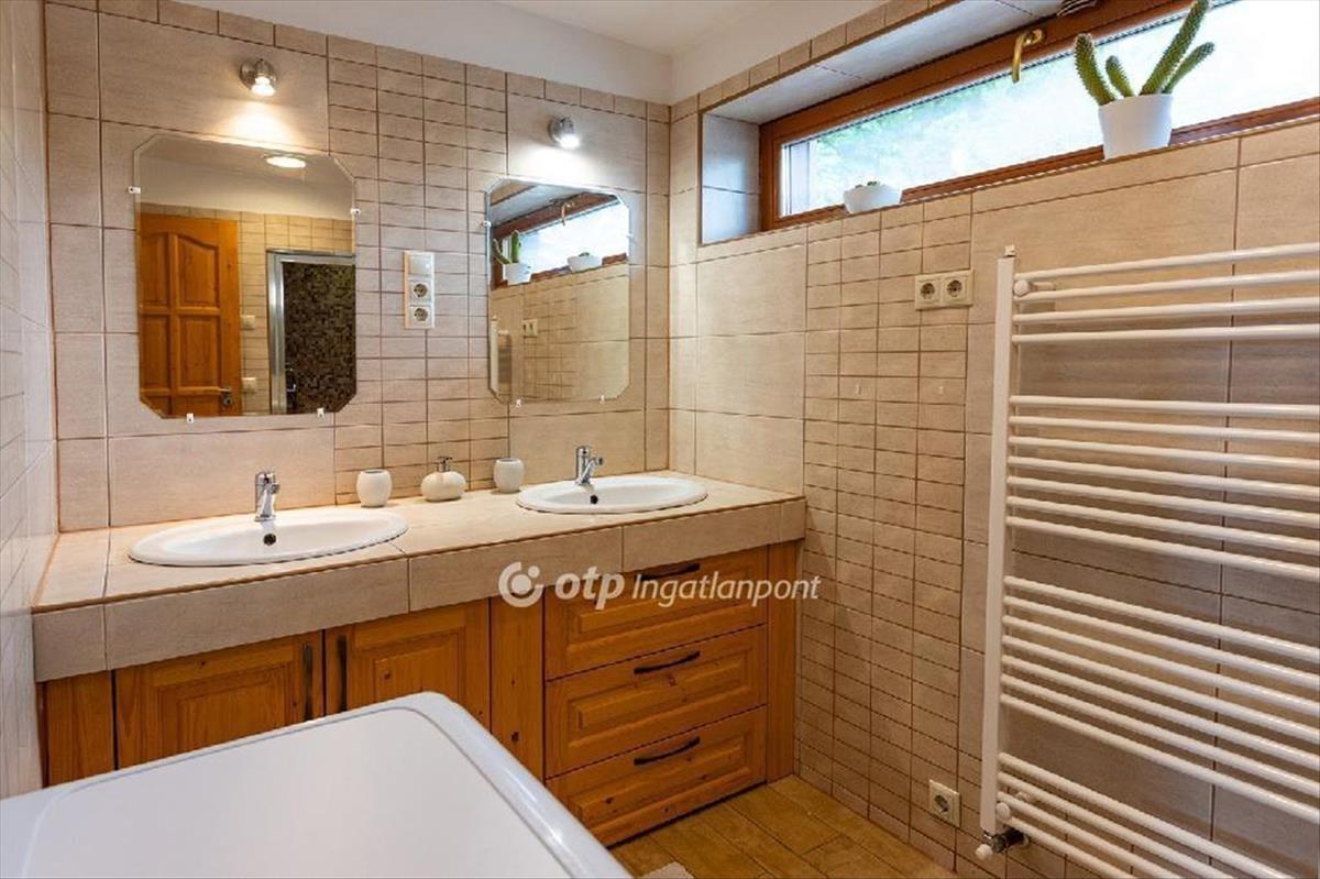 Földszint: amerikai konyhás nappali kertkapcsolattal, 2 háló, fürdő (hidromasszázs kád + szauna), külön WC.