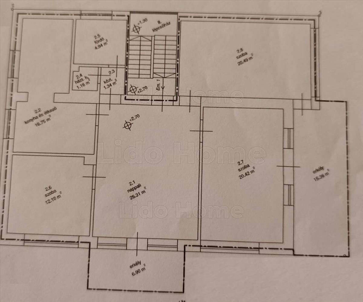 -Emeleti helyiségek: (104 m2+7 m2 és 15 m2 erkély+8 m2 lépcsőház) fürdőszoba, külön illemhely, nappali, három hálószoba, konyha-étkező, két erkély, lépcsőház.