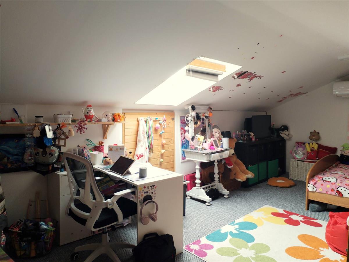 A felső szinten a teljes víz- és villanyhálózat cseréje megtörtént, új műanyag nyílászárók kerültek beépítésre, a nappaliban klíma biztosítja a kellemes hőmérsékletet, és a tetőtéri szobában is klíma gondoskodik a komfortérzetről.
