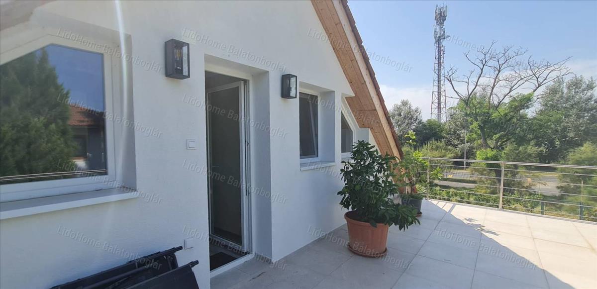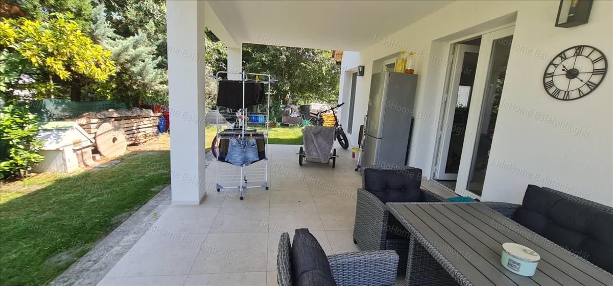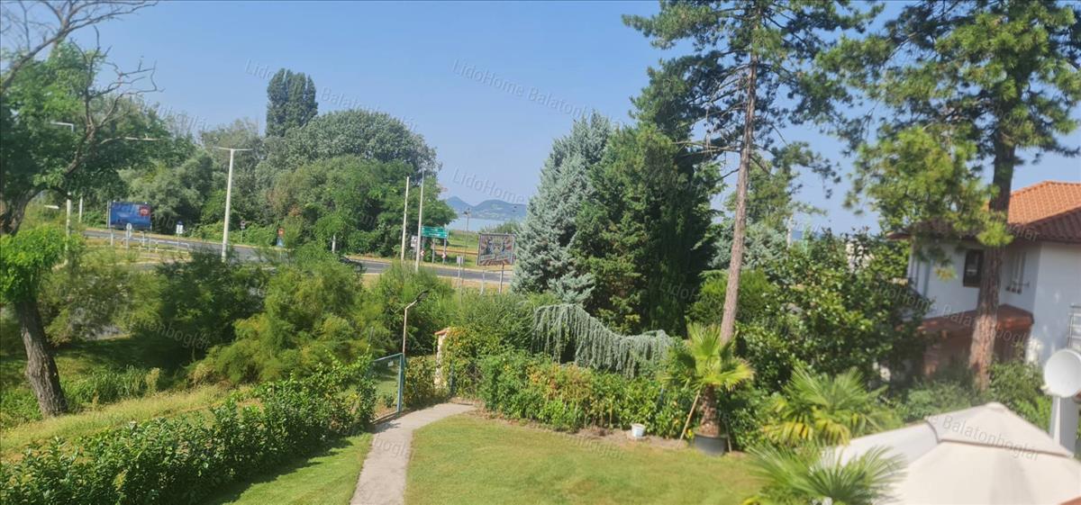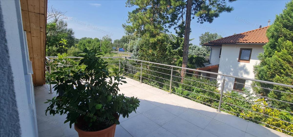 A 2015 négyzetméteres telek közepén, az utca szinttől magasabban került felépítésre a ház. Körbejárható, a minden oldalon lévő ablakok miatt nagyon világosak és naposak a belső helyiségek. Körben, mindkét szinten több terasz és erkély található. Innen gyönyörködhetünk a felső erkélyről látható Balatoni panorámában és a szépen kialakított, különleges növényekkel beültetett kertben.