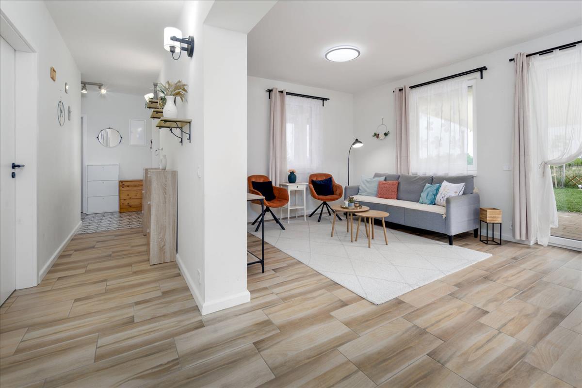A földszintes ház 2021-ben épült, minőségi anyagokból, igényes kivitelezéssel. Tervezésénél fontos szempont volt a tágas terek kialakítása és a praktikus elrendezés.
