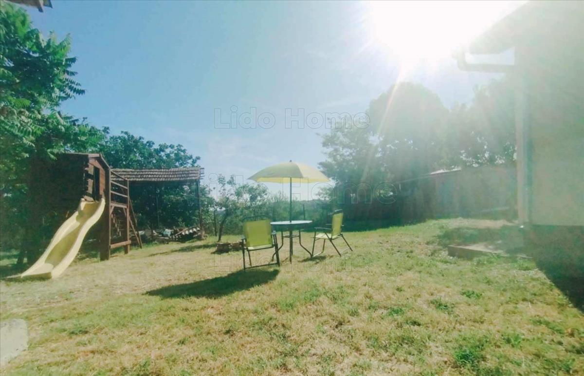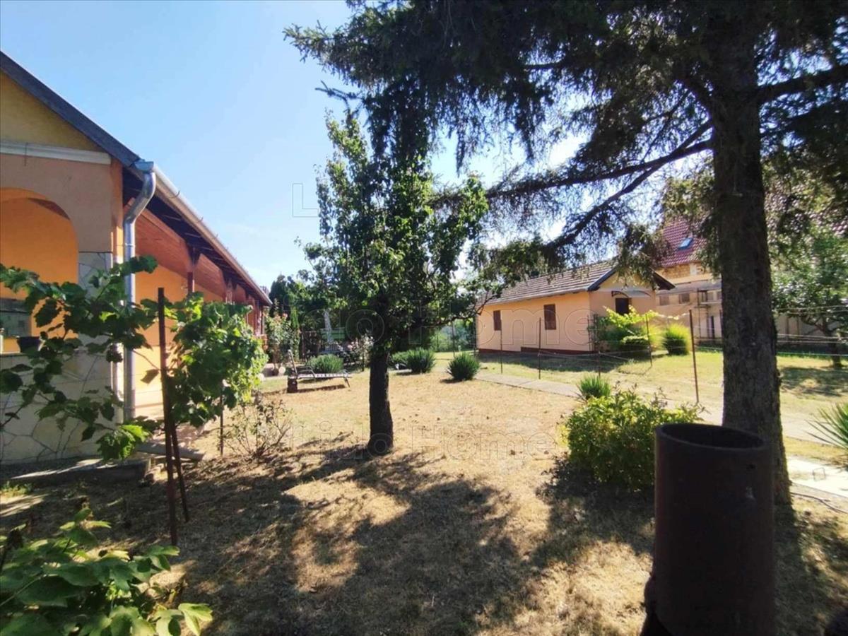 -A ház körül kisebb méretű (kb. 1000 m2) kerítéssel leválasztott, gondozott udvarban gyümölcsfák, szőlő és örökzöldek, a terület könnyen karbantartható, ideális pihenésre vagy kertészkedésre.