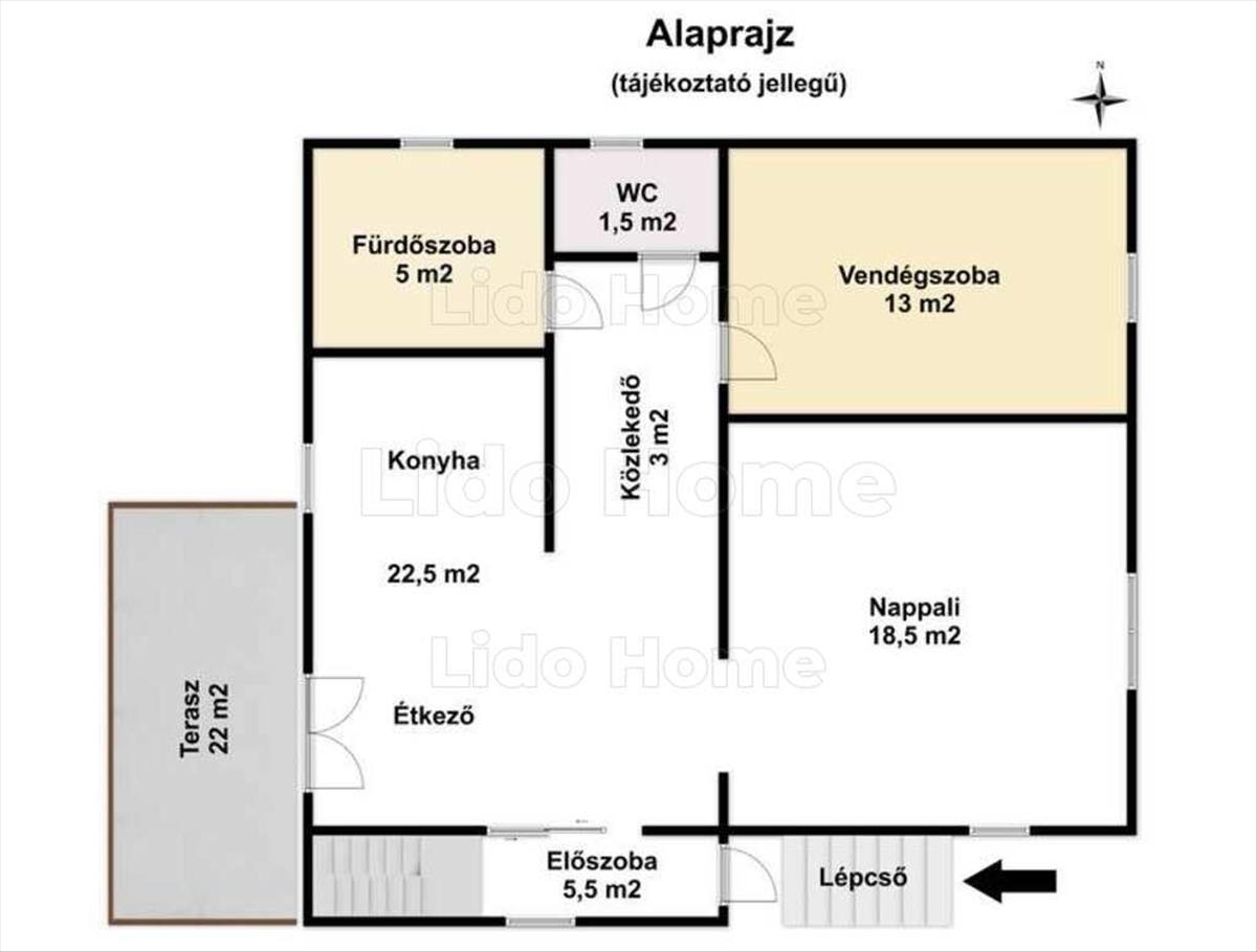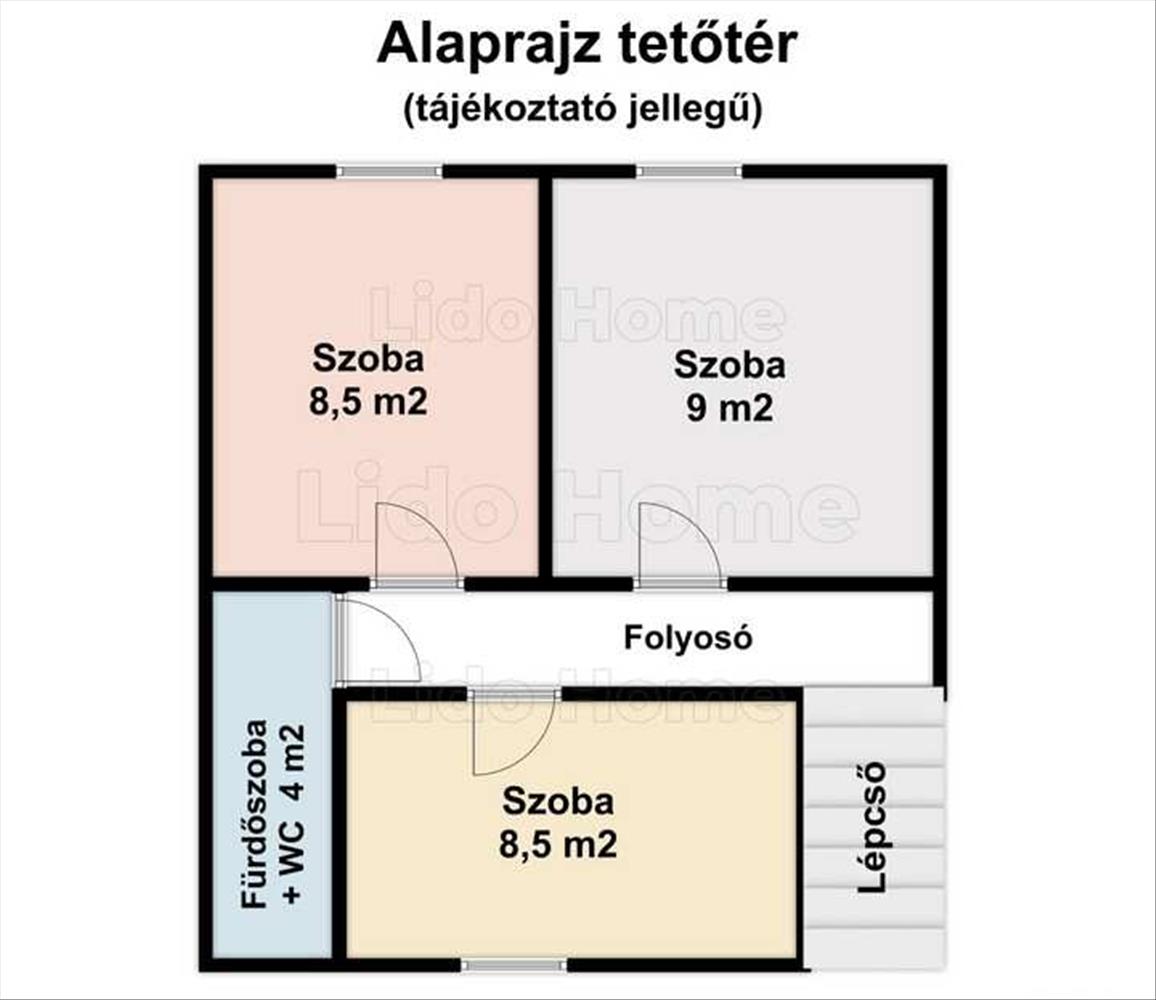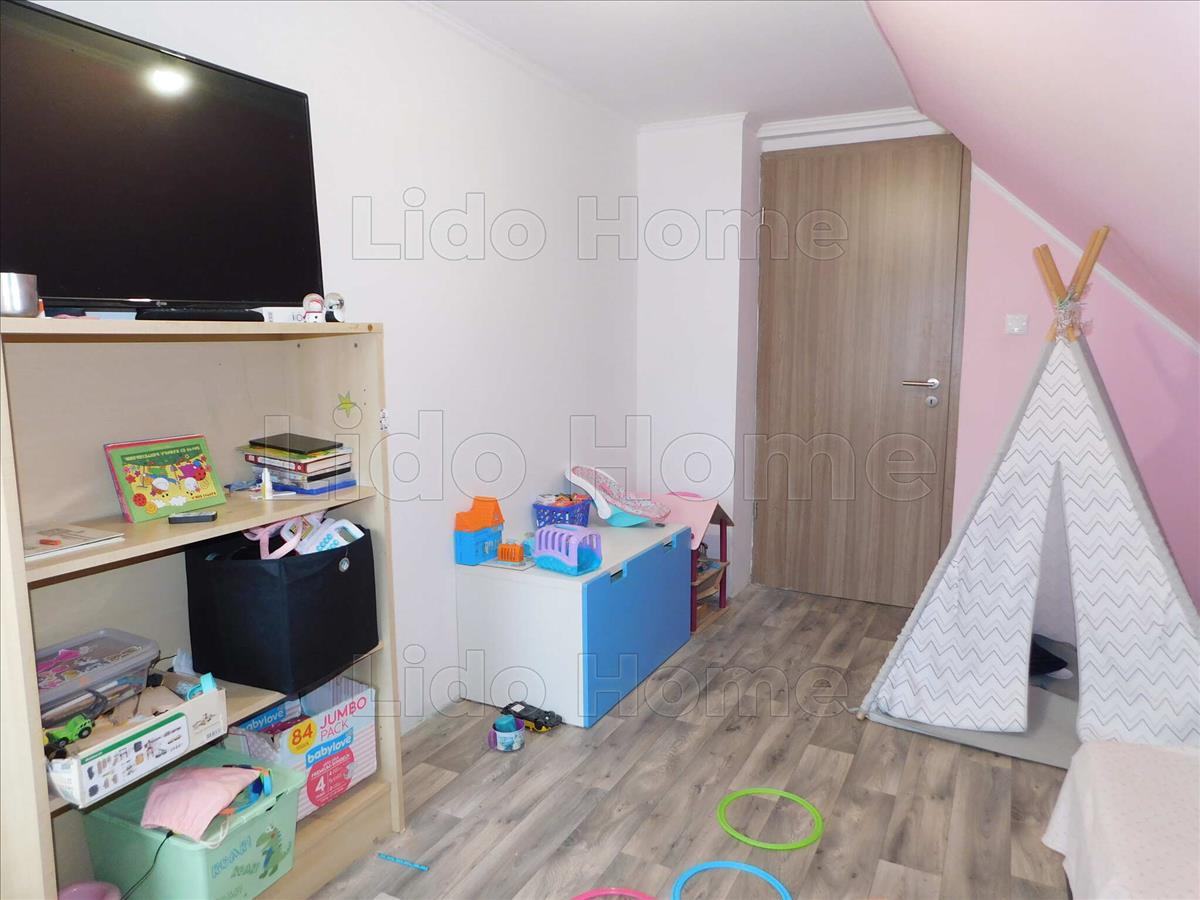 a földszinten előszobából nyíló 41 m2-es amerikai konyhás nappali, vendégszoba, zuhanyzós fürdőszoba, külön illemhely, közel 70 m2-en. a tetőtérben a folyosóról három szoba és egy sarokkádas fürdőszoba+WC nyílik.