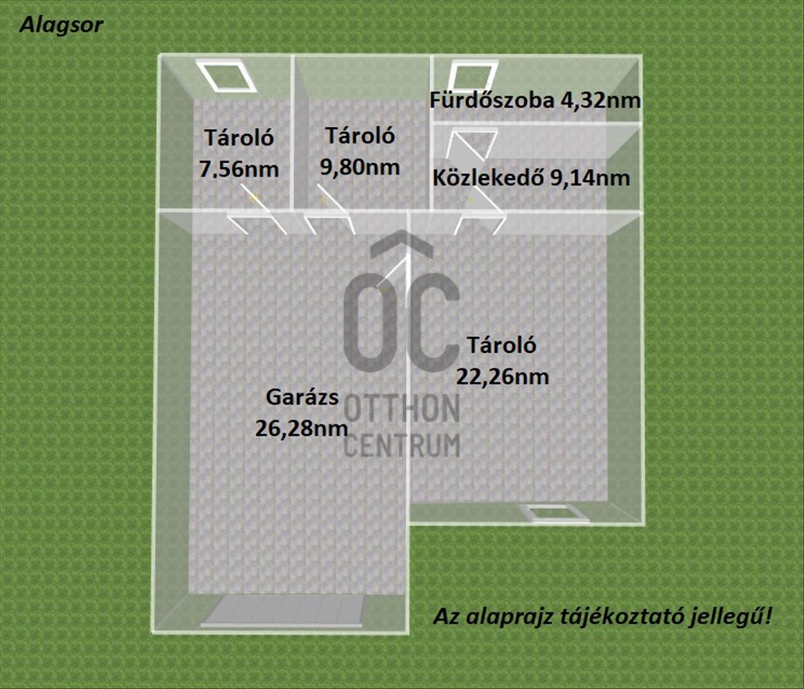 Az alagsorban található egy 26nm-es garázs, egy fatároló, ahol helyet kaptak a kazánok is, 2 külön tároló és egy fürdőszoba, innen is feljuthatunk a földszintre. a földszinten egy előszobába érkezünk, ahonnan egy mosdó nyílik, 2 szoba, 1 étkező és 1konyha is helyet kapott. Az emeleten további 3szoba és 1 fürdoszba(zuhanyzóval, káddal egyaránt ellátott) található.