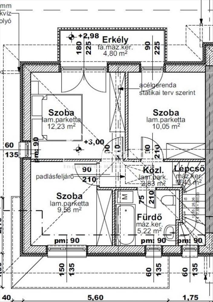 - Felső szint: 3 szoba (2 erkélyes kapcsolattal) és kádas fürdőszoba.
