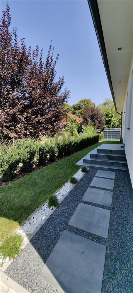 Kertépítők által tervezett gyönyörű kert várja következő tulajdonosát. Dupla vakondháló, gyepszőnyeg, automata locsolórendszer, ami 80 m mély fúrt kútról működik, robotfűnyíró, szomszédok felé minden oldalon sövények (babérmeggy, leylandi ciprus). a kerítésen kívüli utcafront is hasonlóan igényes, rendezett.