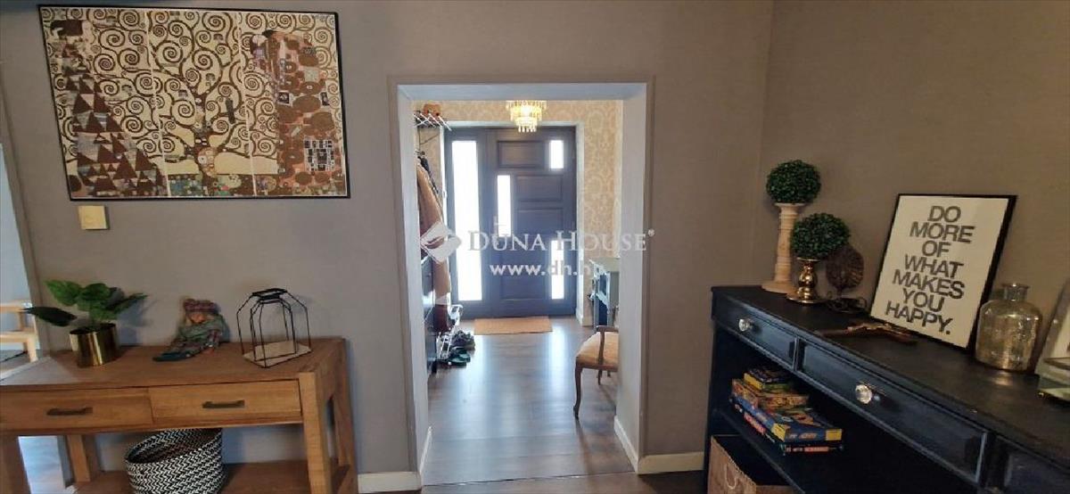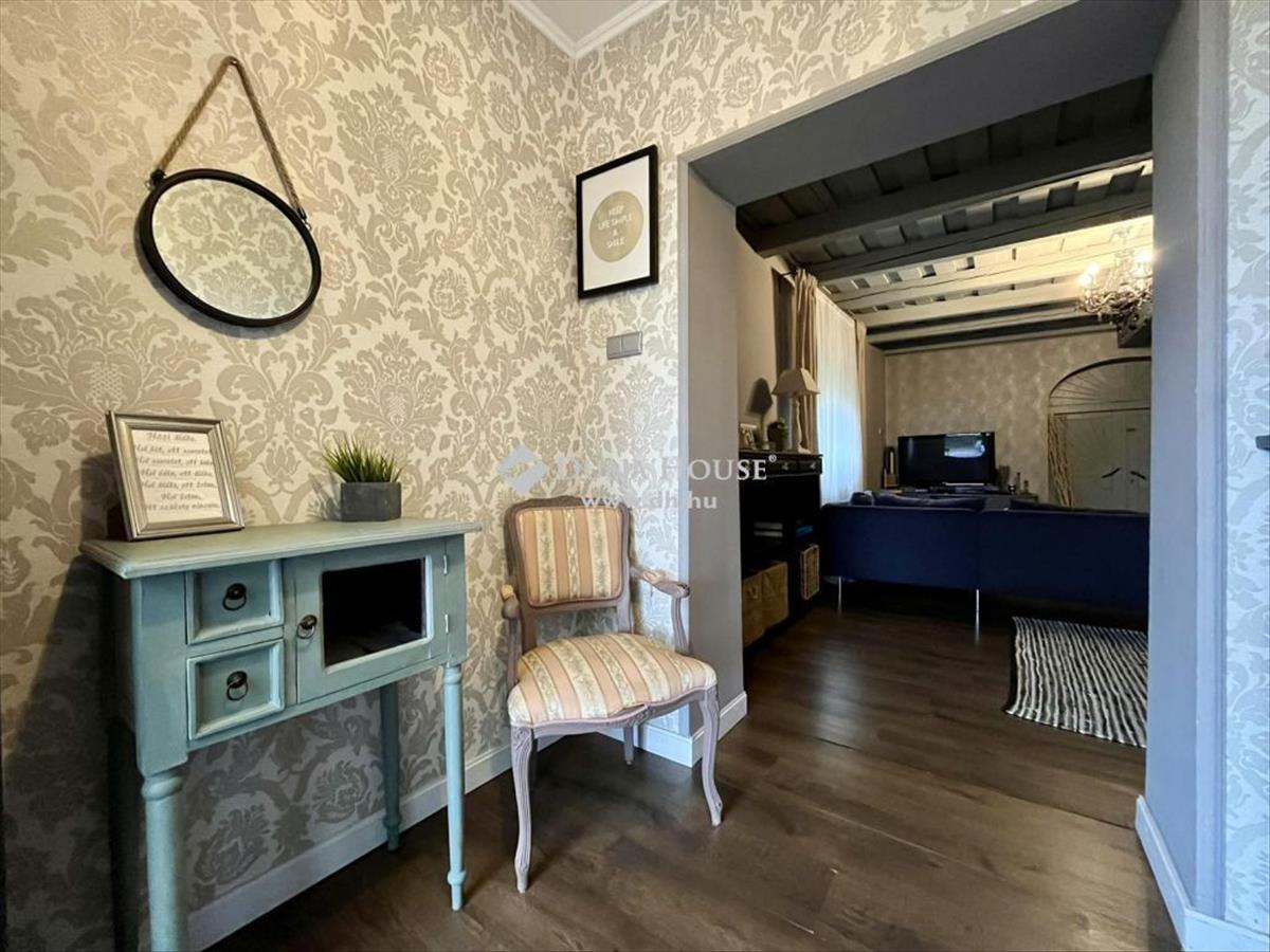 A nappali kétségtelenül szembeötlő eleme a mennyezeti fagerenda, mely szintén felújított állapotban, ápolt külsővel díszíti helyiségünket. Innen nyílik egy tökéletes állapotban lévő fából készült pinceajtó, melyen keresztül beléphetünk be a 12m2-es pincébe.