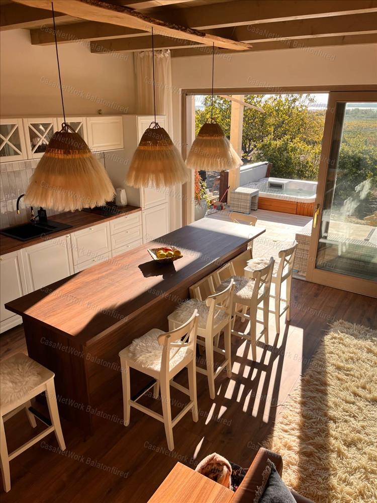 -Egyedi panorámával rendelkező 105 m2-es (kettő terasszal együtt), 3 szobás újépítésű ház Balatonfüreden.