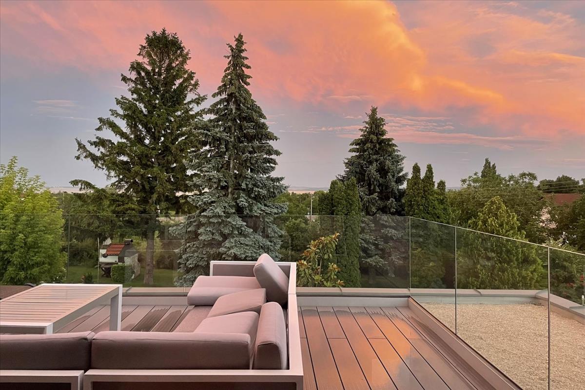 50 m2 gyönyörű balatoni panorámás D-DK. I fekvésű, modern üvegkorláttal ellátott terasz