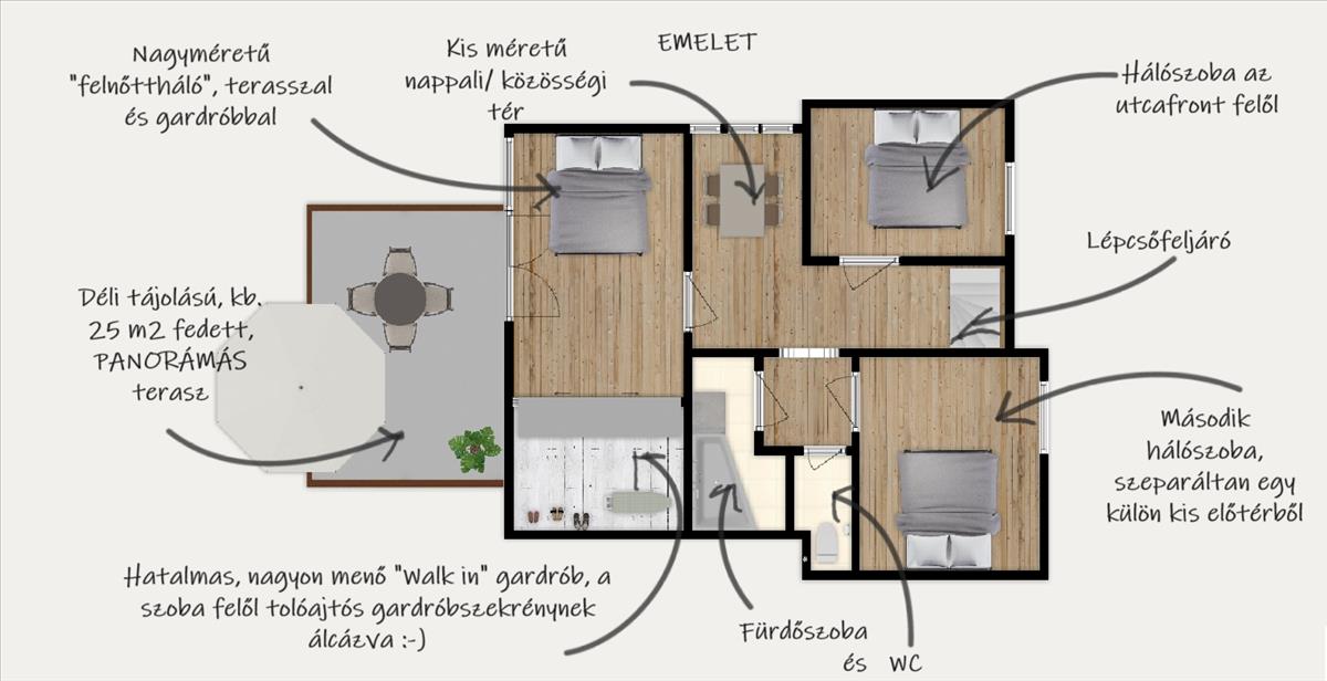 Az emeleten 3 hálószoba található, melyből egy a Balatonra panorámás teraszra (25 m2) nyílik, van egy kisebb nappali + fürdőszoba, wc és egy hatalmas gardrób is kialakításra került.