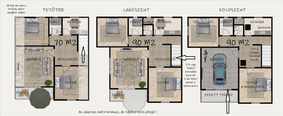 Szintenként 8m2 erkély tartozik még hozzá, melynek a mérete az alapterülethez nem lett hozzászámolva, így kétszer 90 m2, valamint a 70 m2 tetőtér egyben a nettó területe is.