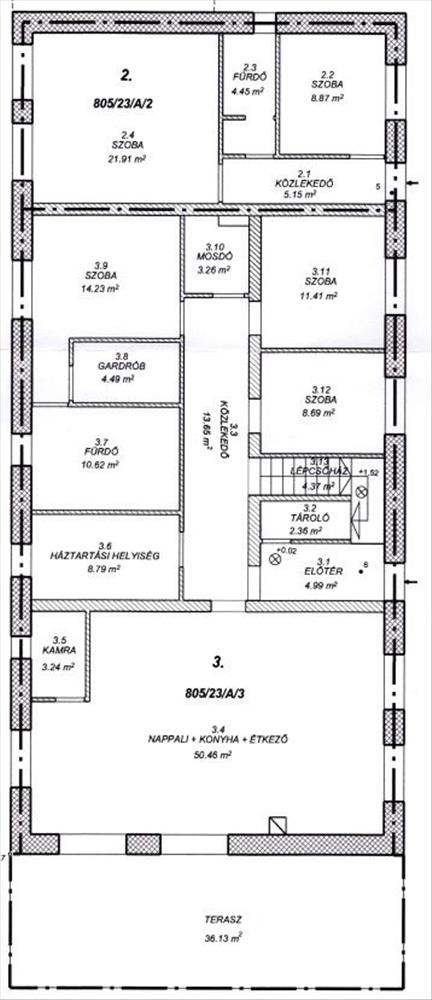 Az egyik lakrész 225m2, melynek földszintjén található 50m2-es teraszkapcsolatos amerikai konyhás étkező-nappali, ahol nagyobb család vagy baráti társaság kényelmesen elfér a terített asztalnál. Továbbá 1 hálószoba hozzá kapcsolódó tágas fürdőszoba sarokkáddal és kétszemélyes zuhanyzóval, külön nyíló 2 szoba, gardrób, fürdő-wc, háztartási helység, tároló, kamra, közlekedő, előtér, lépcsőház. Az emeleten nappali, külön nyíló 2 szoba, fürdőszoba sarokkáddal, gardrób, közlekedő került kialakításra.