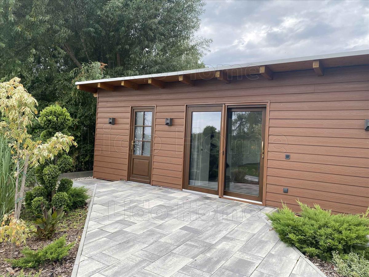A telek hátsó részén álló vendégház 30 m2-es. Elosztása: nagy szoba, fürdőszoba, külső bejáratú tároló. Külső burkolata kiváló minőségű Cedral homlokzati szálcement lapokból készült, ami hosszú élettartamú és nem igényel utólagos karbantartást.