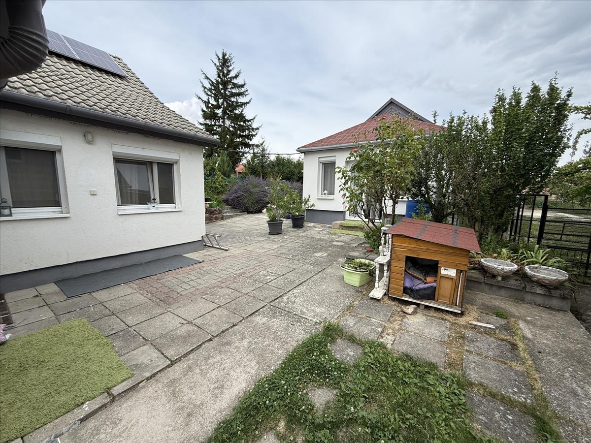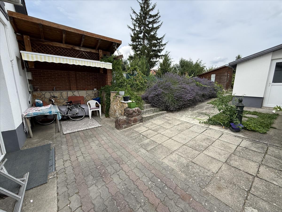 Az udvar minden szempontból jól átgondolt: térkövezett, rendezett, akár autó számára is biztosít parkolást. Egy 25 m²-es, fedett kiülő teremt kellemes, árnyékos pihenőhelyet, emellett fa tároló gondoskodik a kerti szerszámok és kerékpárok elhelyezéséről, valamint a ház alatt egy 12 m2-es pince is megtalálható.