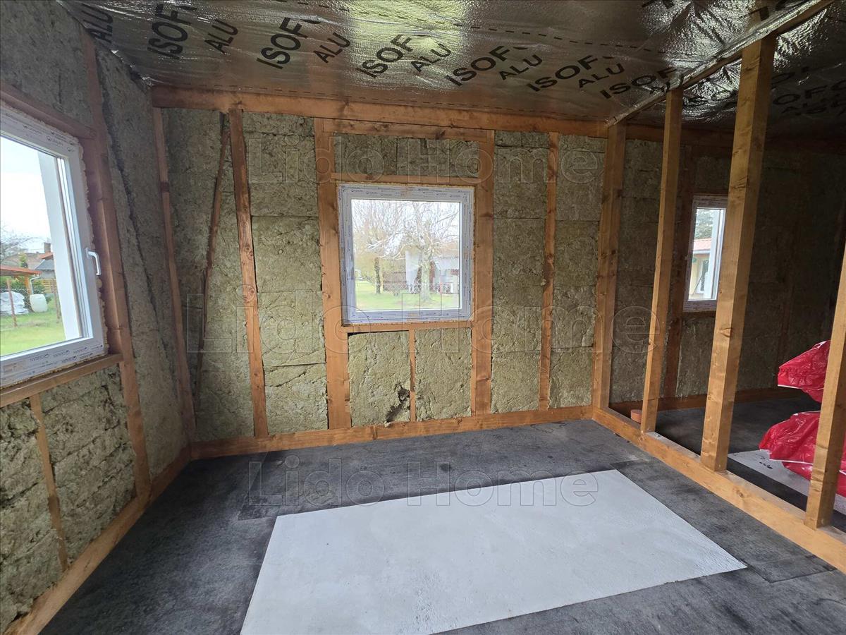 -Belső elosztása jól átgondolt és praktikus. a házban amerikai konyhás nappali, 2 hálószoba, fürdőszoba és egy előtér kapott helyet.