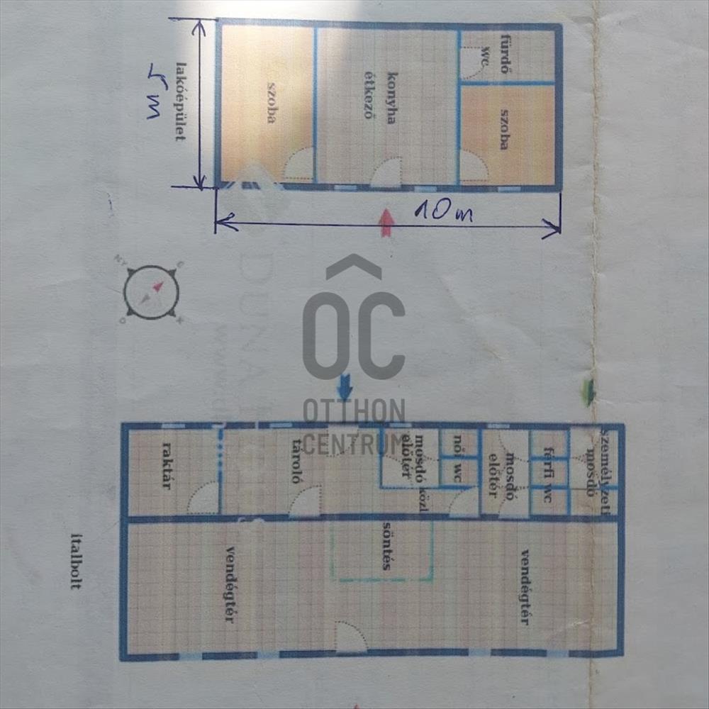 -helyiségei: fürdő-wc, konyha-étkező, szoba, és egy nagy szoba, vagy üzlettérnek alkalmas helyiség.