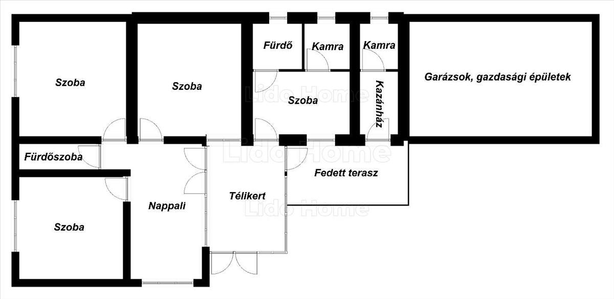-a ház elosztása: télikert, nappali, 3 hálószoba, 2 fürdőszoba, konyha étkezővel és kamrával.