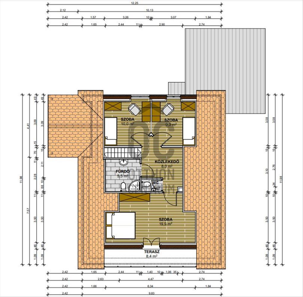 Az emeleten 3 lakószoba, melyből az egyik erkélykapcsolatos, egy fürdő és egy külön wc található.