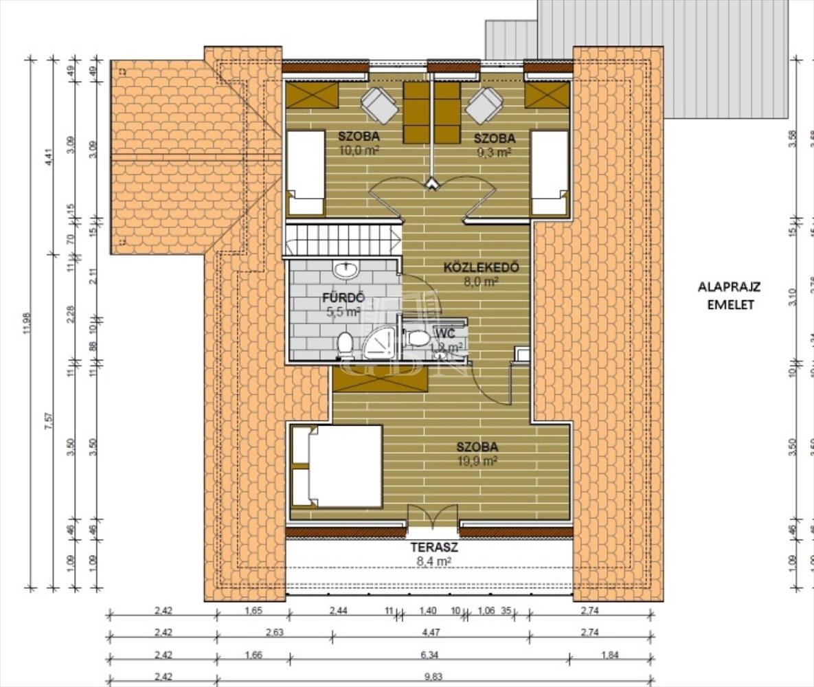 EMELET: szoba (10m2), szoba (9m2), szoba (20m2), fürdő, wc, terasz (8m2)