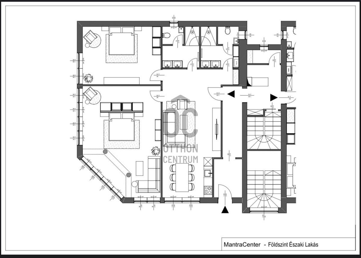 Földszint: 2 lakás (2 szobás az egyik, a másik is jelenleg 2, de azt könnyen háromra lehet bővíteni. Mind a kettőhöz tartozik nappali, 2 fürdő (wc, zuhanyzó vagy fürdőkád, konyha, étkező, nappali), recepciónak alkalmas helyiség, lépcsőház.
