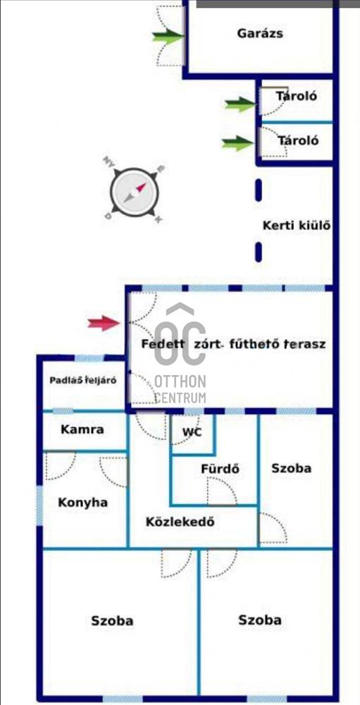 Elosztása: 3 szoba, konyha-étkező, beépített-fűthető terasz, fürdőszoba, 2 tároló, garázs, kerti kiülő.