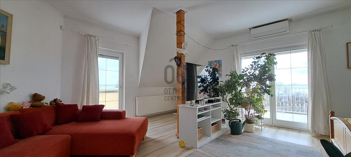 Az alsó szinten tágas élettér került kialakításra, amely ideális családi együttlétekhez és vendégfogadáshoz. a konyha - nappali - étkező mellett egy hálószoba, és fürdőszoba található még itt, erről a szintről tudjuk megközelíteni a hatalmas méretű teraszt, ahonnét gyönyörködhetünk a tulajdonosok kezei által gondozott, virágokkal és veteményeskerttel tarkított kertben és innen a Balaton víztükre is megcsillan. Az emeleti részen egy nagyméretű hálószoba található, melyhez erkély is kapcsolódik, innen csodálatos balatoni panoráma tárul elénk. Ezen a szinten lett kialakítva még két lakószoba és két fürdőszoba is.