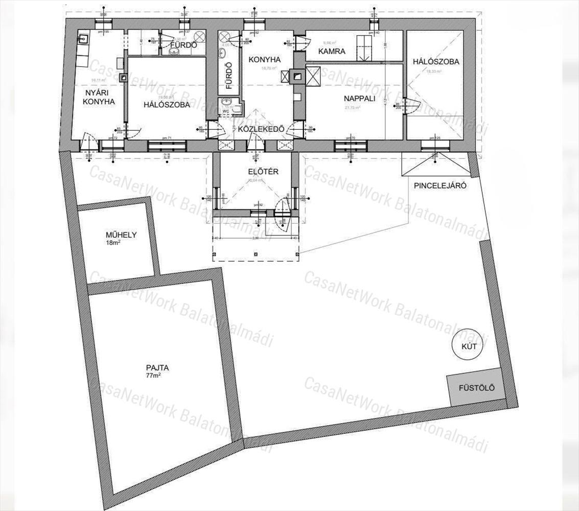 - remek adottságú, bájos udvara optimális méretű: pajtával, műhellyel, füstölővel, ásott kúttal és kerti csappal; intimitást, zöld felületet, árnyékot ad, sok kerti munkát nem