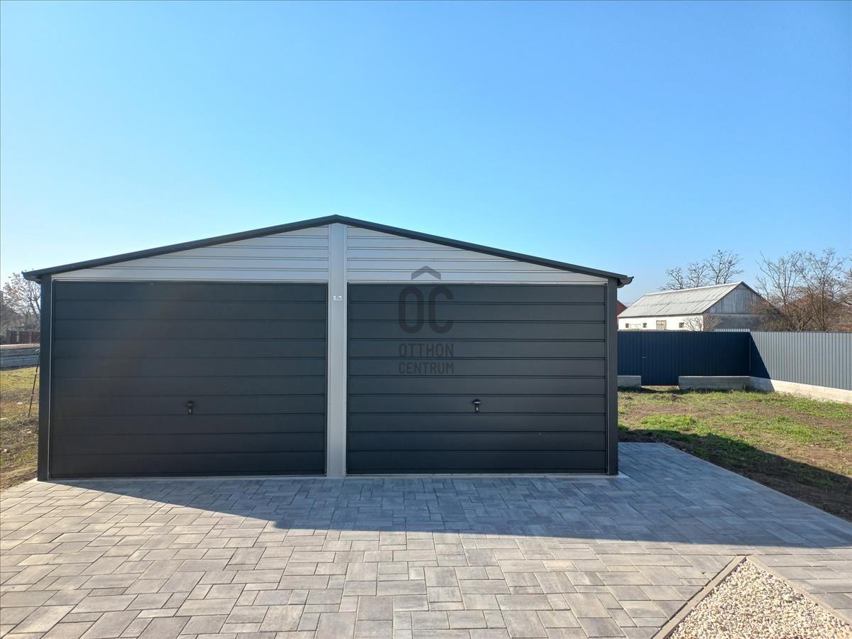 Új, épített kerítés, elektromos kapu előkészítéssel, térkövezett járda, gépkocsibeálló és új 2 férőhelyes tágas garázs.
