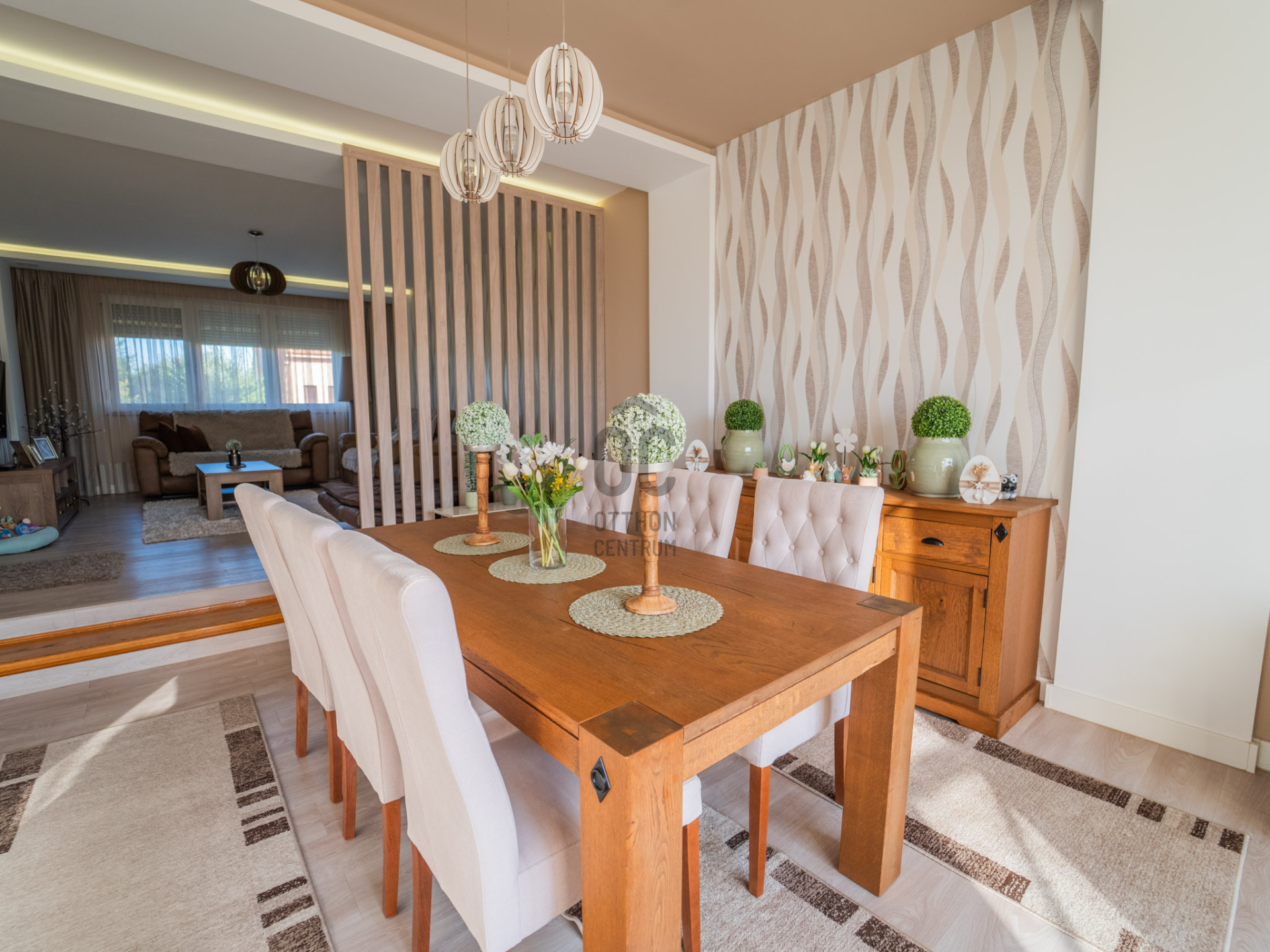 - Konyha- étkező ( közvetlen terasz kapcsolattal) és nappali egy légtérben került kialakításra a földszinten, ahol még fürdőszoba, kölön wc, kamra és előszoba található
