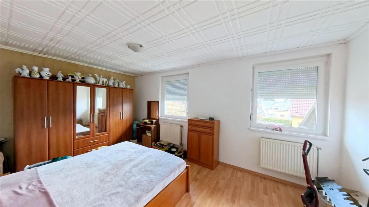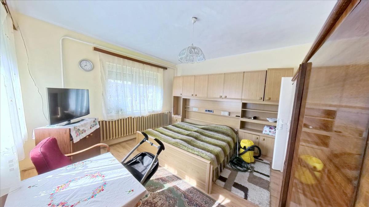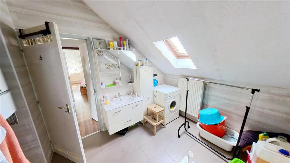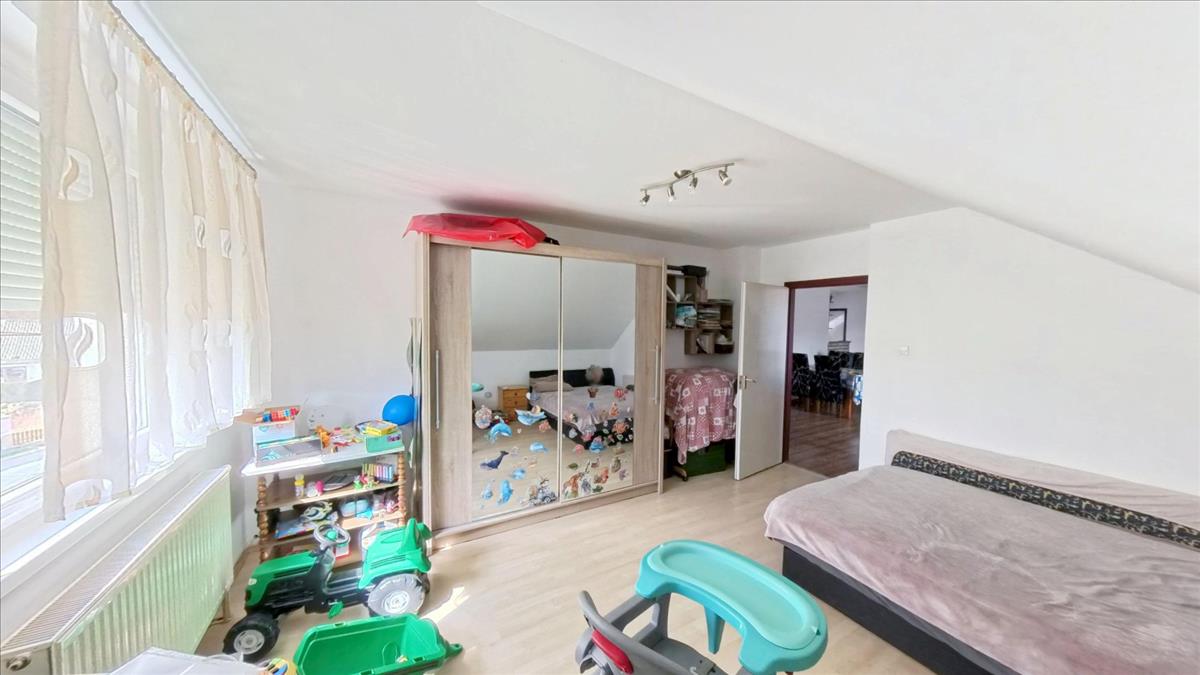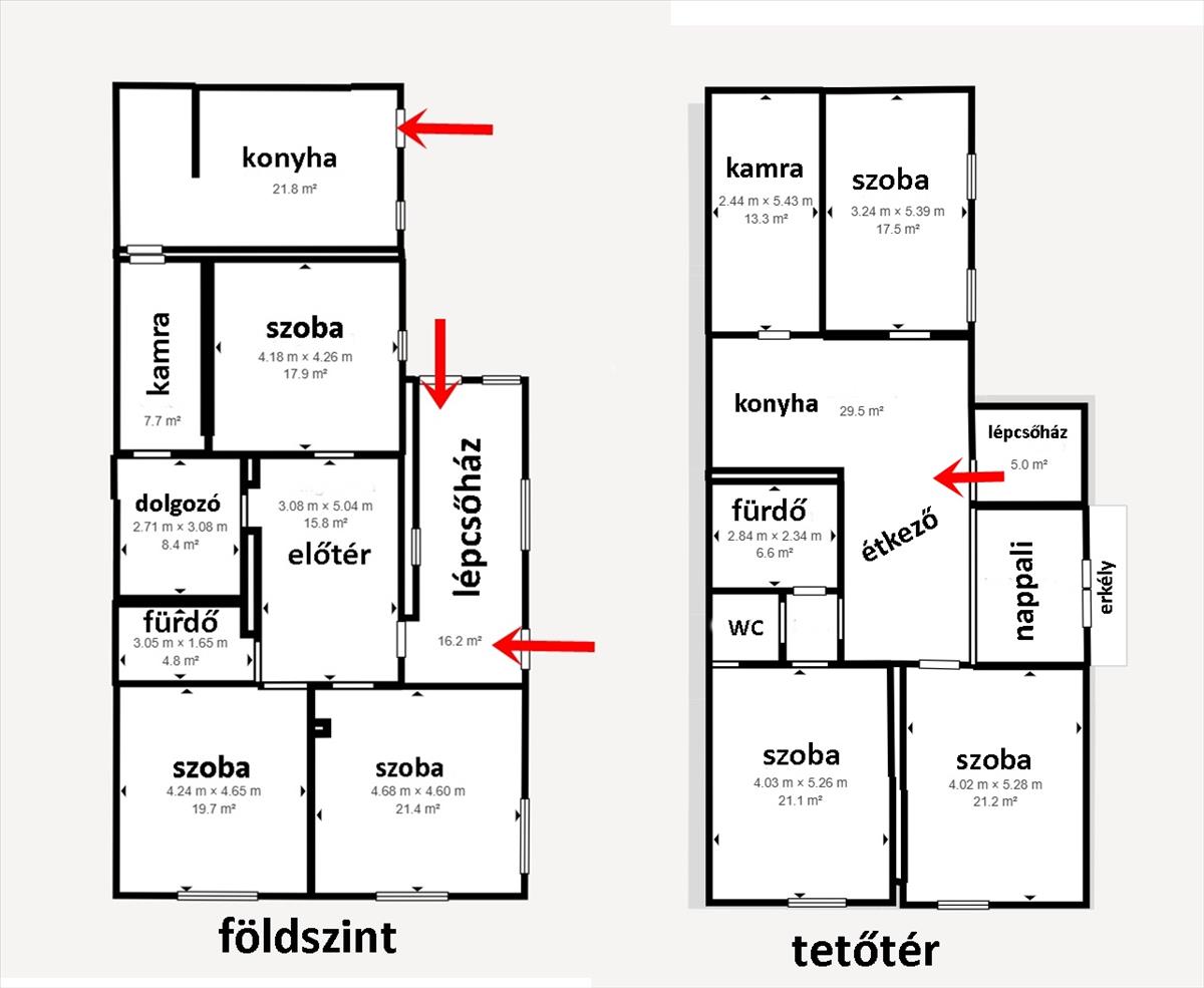 A két utcáról is megközelíthető ingatlanon egy téglából épült ház van, mely egy földszinti és egy tetőtéri lakórészből áll. Mindkét lakórész külön mérőórákkal van ellátva. Az összesen 265 m2-es hasznos területű ház lakórészenként 132 m2 hasznos lakóterülettel rendelkezik. a házra jellemző a tényleg tágas, nagy terek, a rendkívül világos helyiségek. Mindegyik szinten 3 hálószoba + nappali-étkező, fürdőszoba és konyha található. a lakórészekbe külön két bejáraton keresztül elérhető lépcsőházból juthatunk be. a hőszigetelt ablakokkal ellátott lépcsőház egy méretes előteret is magában foglal.