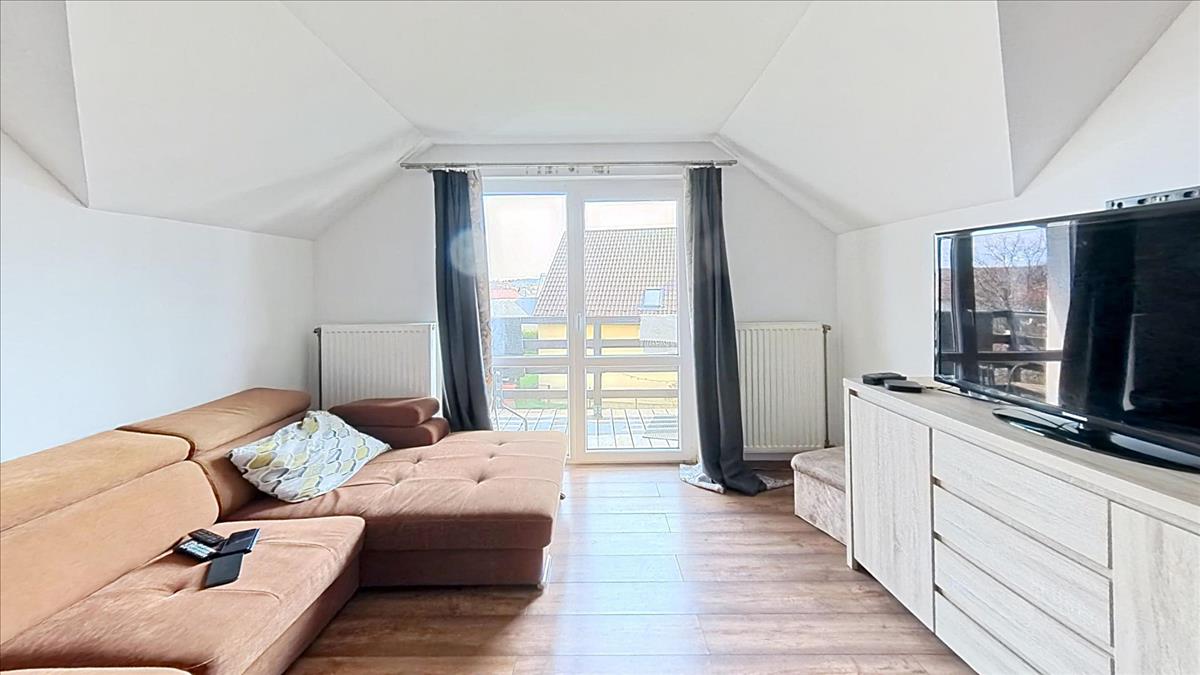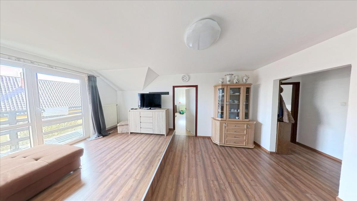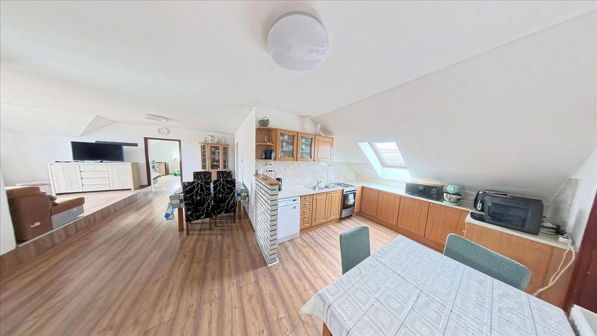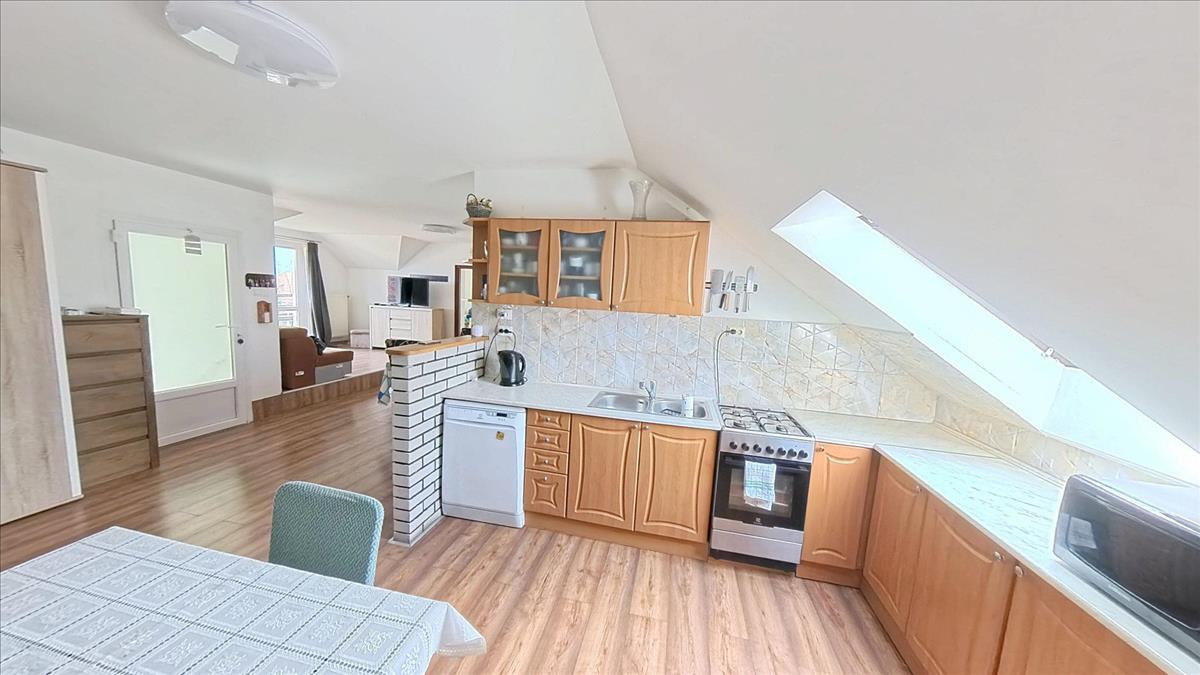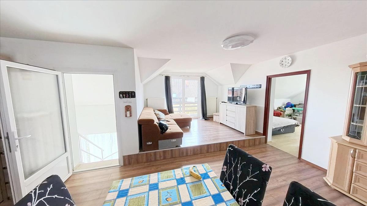 A felső lakórészbe érkezve egy tényleg hatalmas méretű világos nappali-étkező-konyha térbe találjuk magunkat. Balra egy nappali rész van, melyből közvetlenül léphetünk ki a méretes erkélyre, ahonnan kitekintve igazán pompás panorámában gyönyörködhetünk. a nappaliból balra nyílik két nagy méretű, jól berendezhető szoba. a szobák mellett a külön wc és a külön fürdőszoba. a bejárattal szemben a nagyobb társaság számára is tágas étkező van. Jobbra az óriási konyha, melyet egy nagy kamra egészít ki. a konyha mellett a harmadik szoba kapott helyet.
