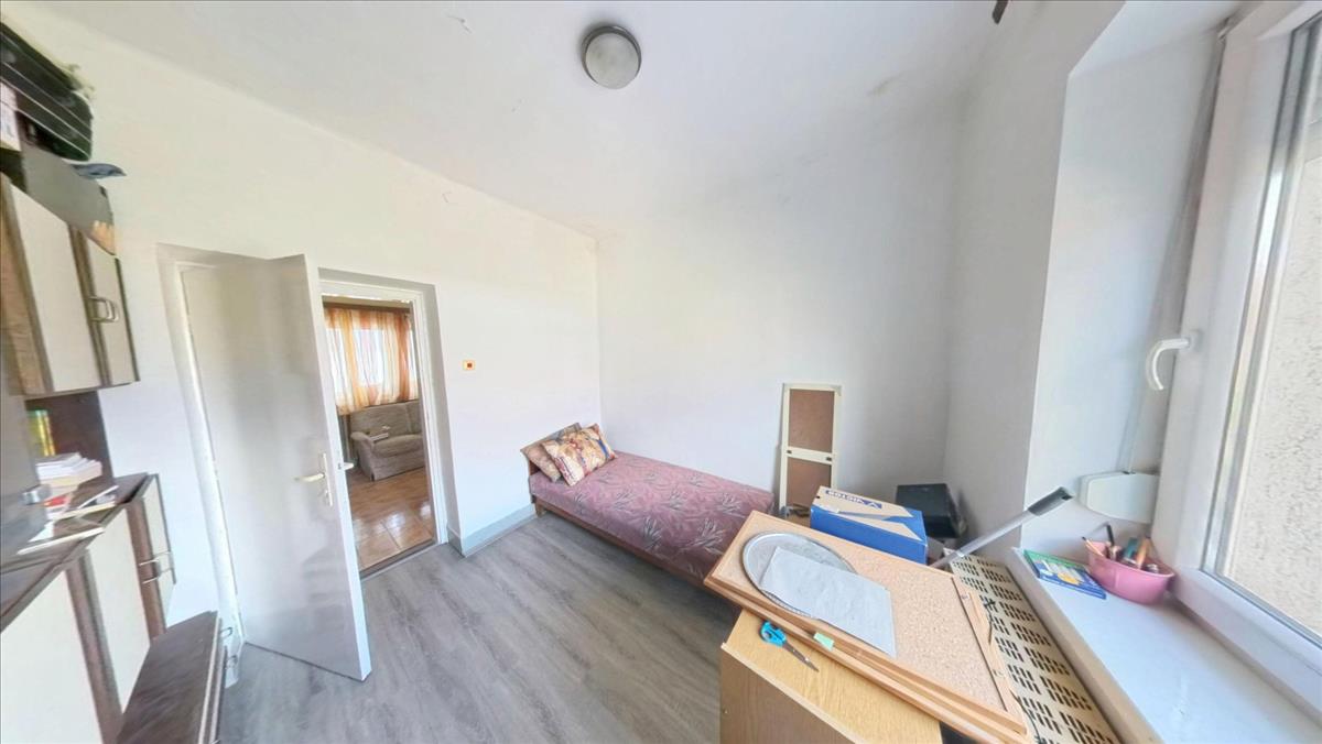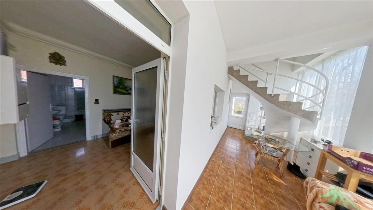 A földszinti lakórészbe belépve egy nappali élettérbe érkezünk. Innen balra az egyik igazán nagy, laminált lappal burkolt szoba van. Mellette találjuk a másik szintén valóban tágas, parkettás szobát. a szoba mellett a fürdőszoba van WC-vel. a bejárattól jobbra a harmadik, parketta borítású, tényleg tágas, világos, jól bútorozható szoba található. a szoba mellett egy dolgozó szoba kapott helyet, melyből egy méretes tároló-kamrán keresztül a nagy konyhába érkezünk. a konyhából közvetlenül léphetünk ki az udvarra. Így a háznak három külön bejárata van: kettő a lépcsőházba vezet, egy pedig a konyhába.