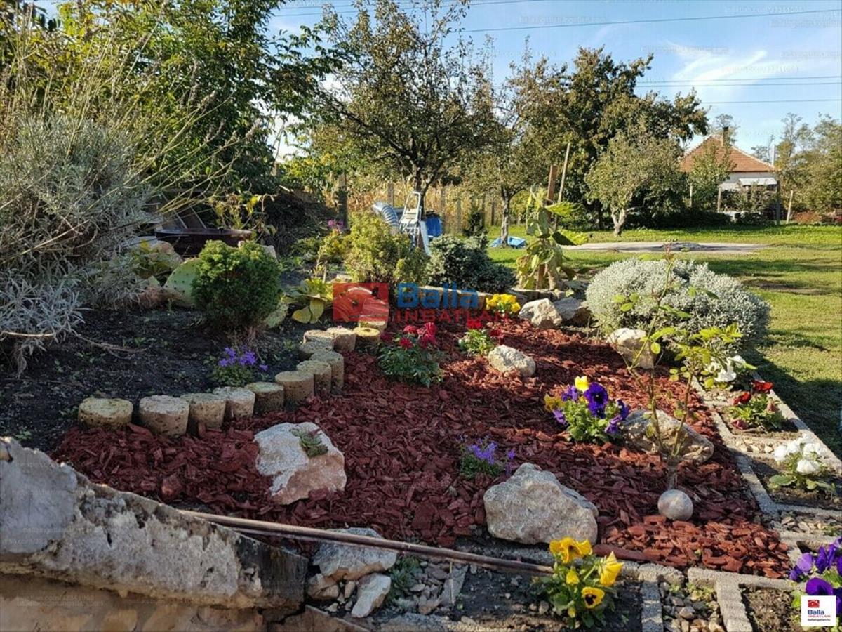 A telek parkosított, solar zuhany, csepegtető locsolórendszer, sziklakert, számos gyümölcsfa, eper és málnabokor található.