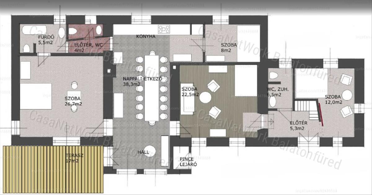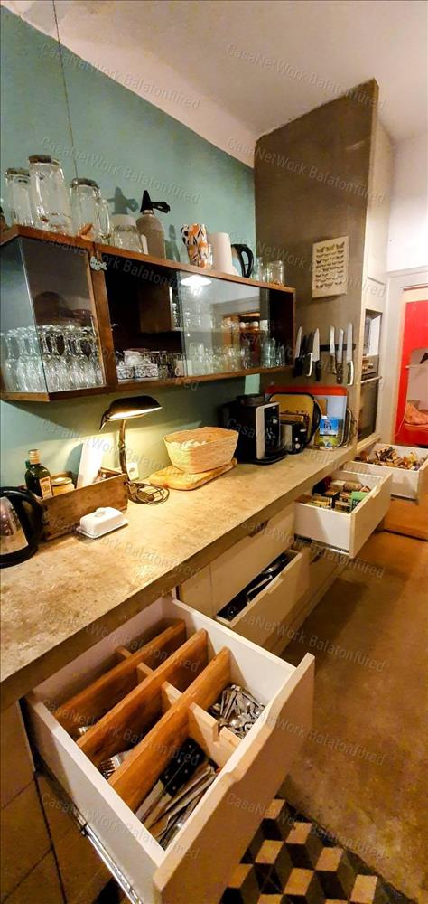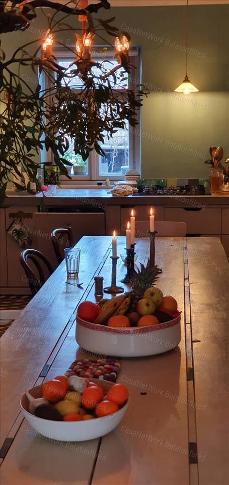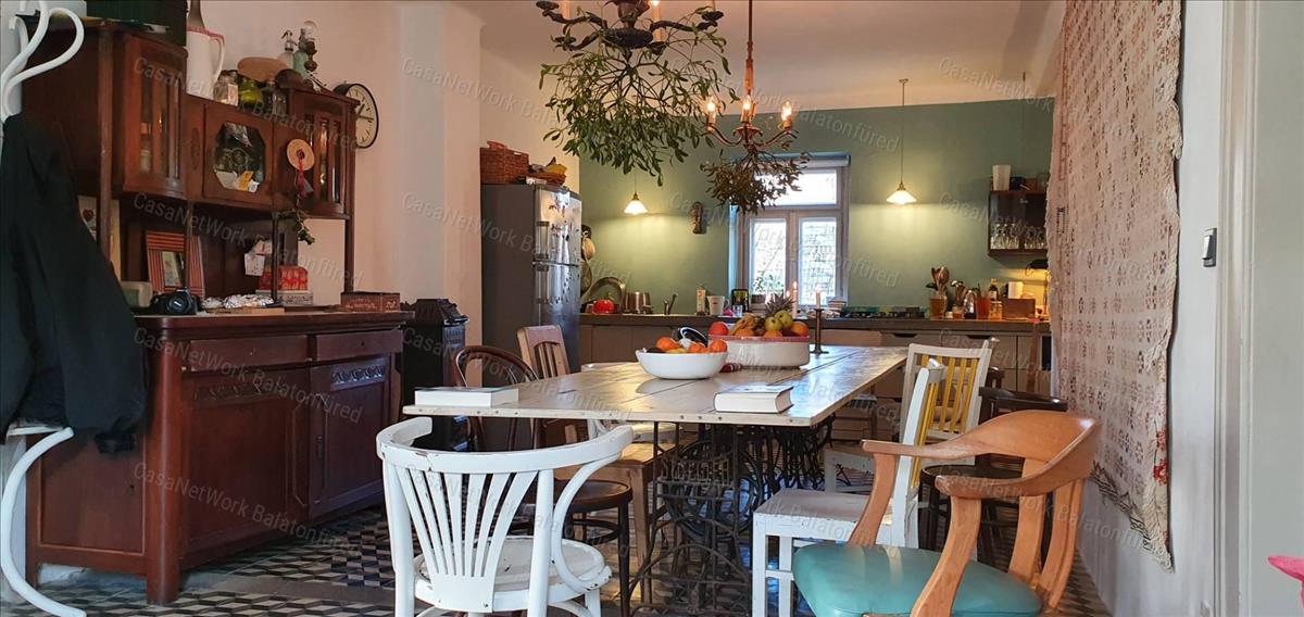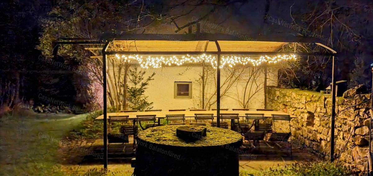 Nagy Ház (130 m²): Teljesen felújított, 4 hálószoba, hatalmas, felszerelt konyha (16 fős asztallal! ), 2 Fürdő, 3 wc, nagy terasz, 30 m²-es boltozatos pince. Modern, távvezérelhető elektromos és faelgázosító kazán. További 60 m² beépíthető tetőtér (+3 szoba! ).