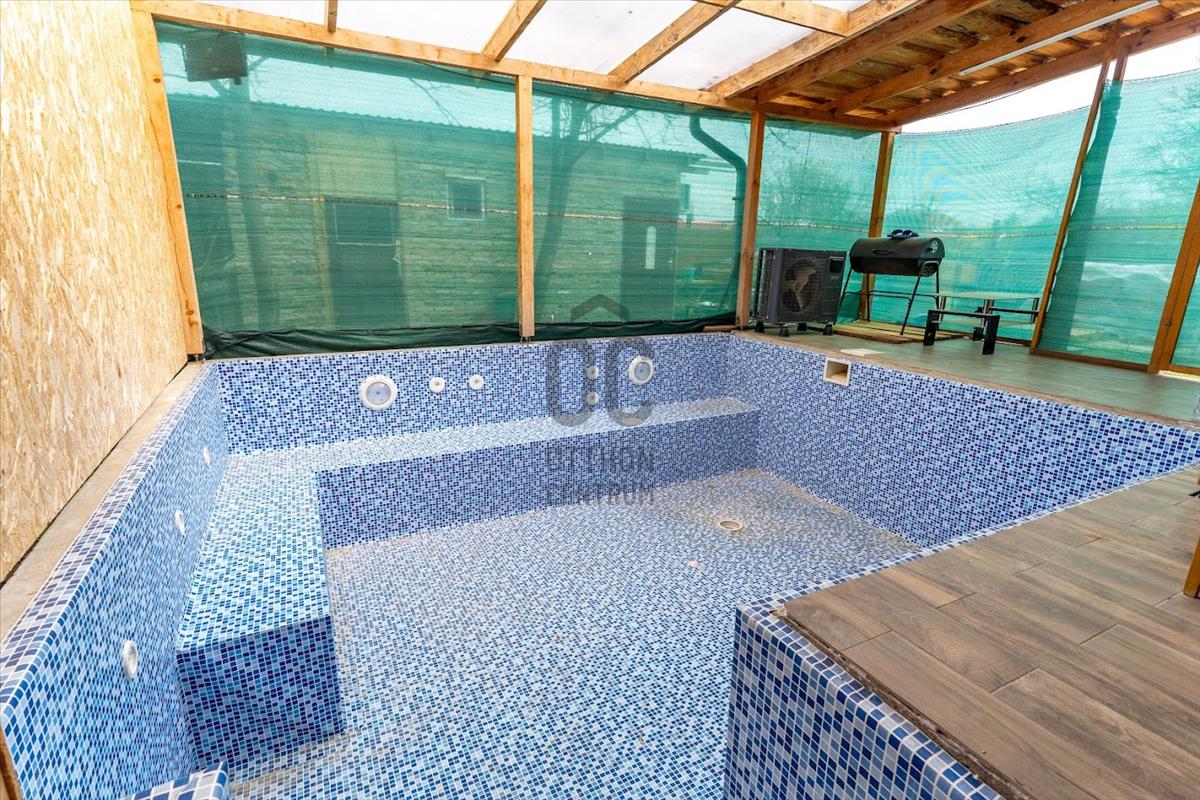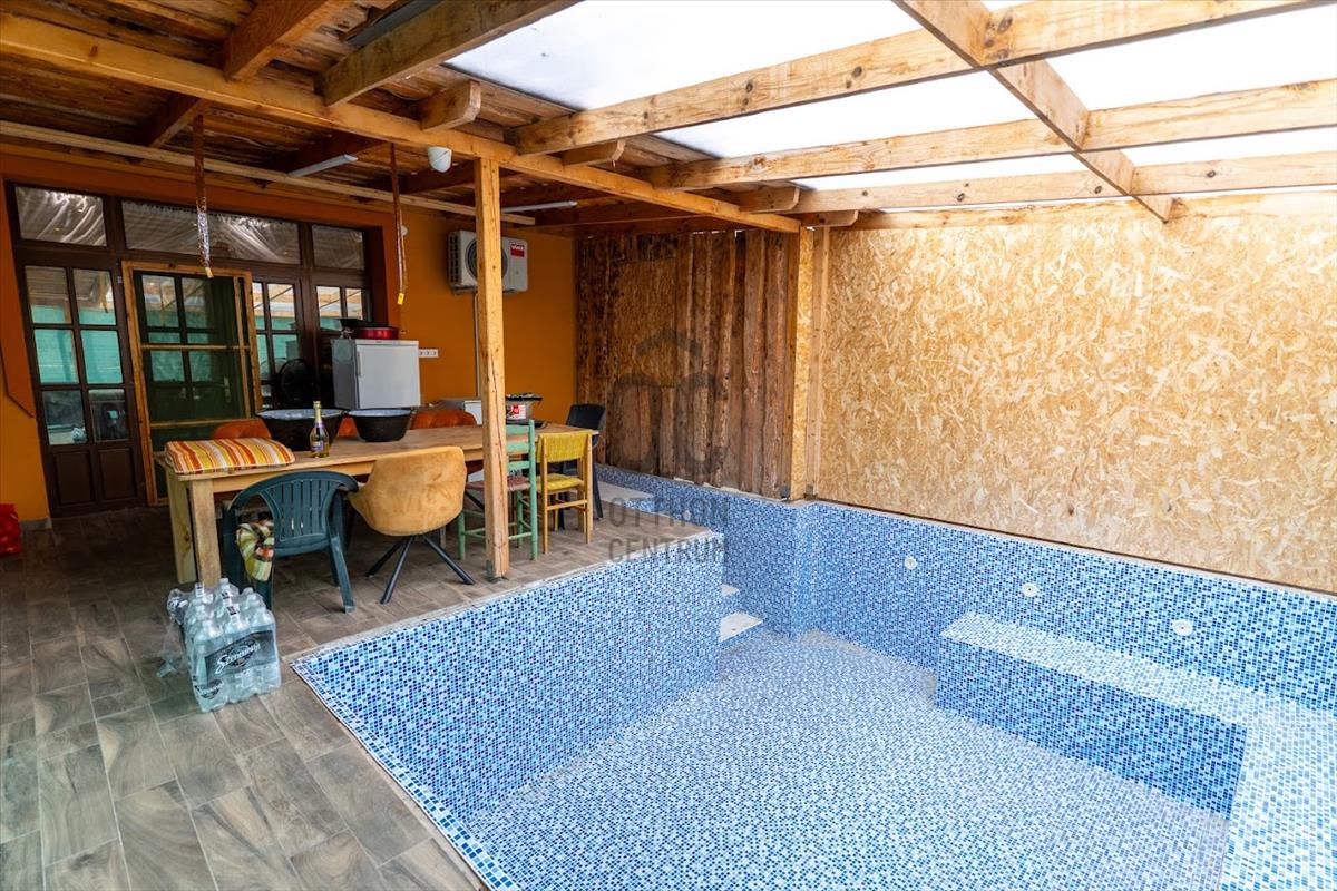 Hőszivattyú fűti a medencét, ami a teraszon található. Süllyesztett, és fedett, 120 centi mély.