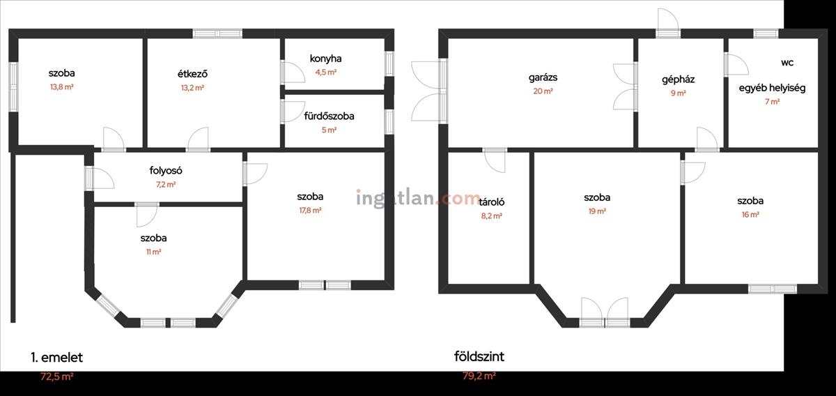 79, 2 m2 földszint - 2 szoba, vizesblokk /egyéb helyiség wc-vel, tároló, garázs, gépház/közlekedő