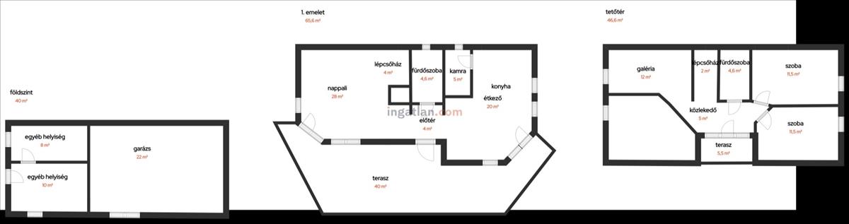 emelet - előtér, konyha+étkező, nappali, nyitott lépcsőház, fürdőszoba wcvel, kamra