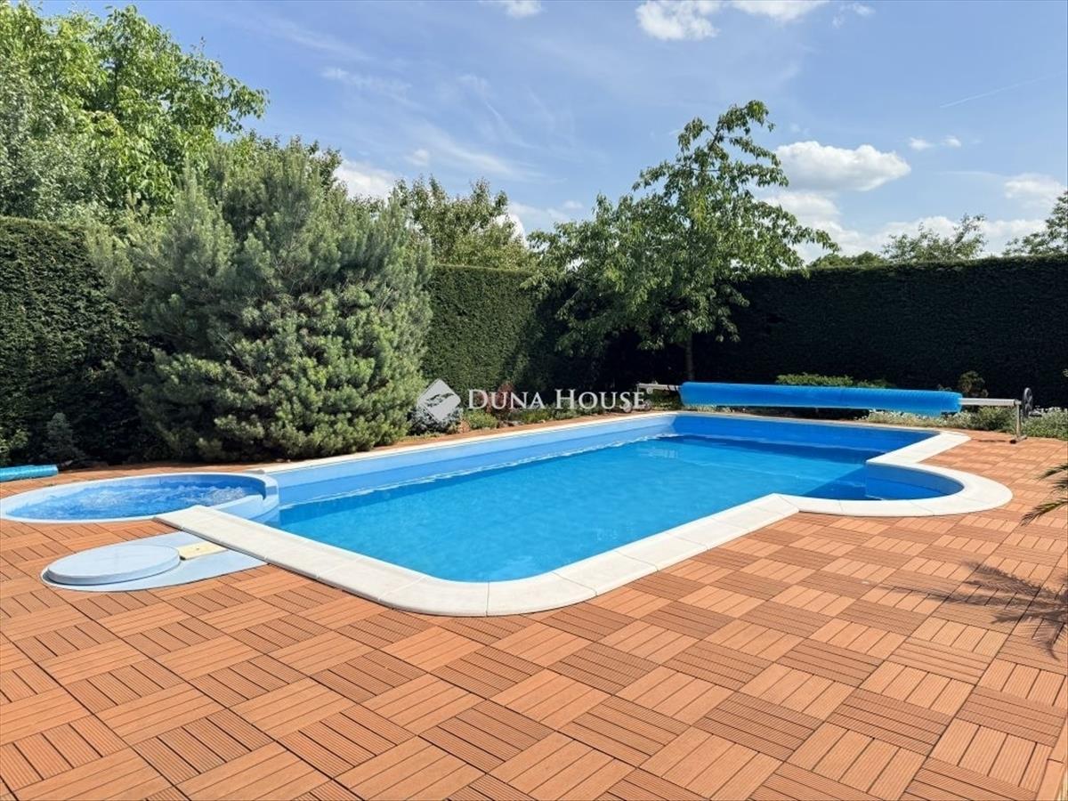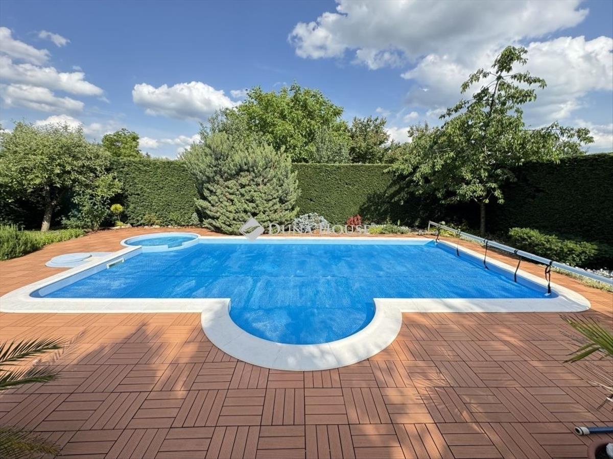 A külső tér ugyanilyen átgondolt: a parkosított kertben egy 4×8 méteres, 1, 5 méter mély medence kapott helyet jakuzzival, amely tökéletes a nyári felfrissüléshez vagy egy nyugodt esti lazításhoz.