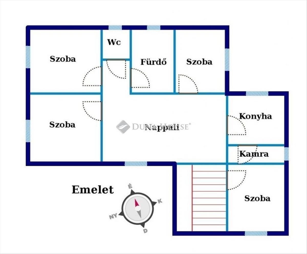 Az emeleti szint szinte egy külön lakásként működik: nappali, négy hálószoba, zuhanyzós fürdőszoba külön WC-vel, valamint külön konyha és kamra is rendelkezésre áll. a fűtés itt lapradiátorokkal történik.
