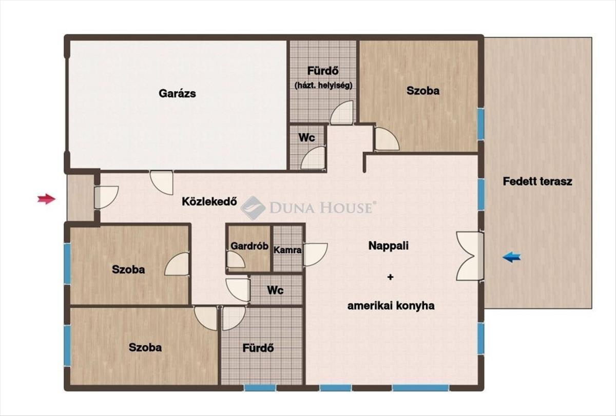- Tágas amerikai konyhás nappali + 3 hálószoba;