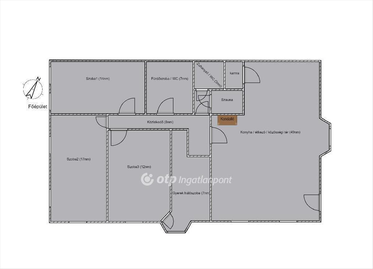Az épület első részén található bejáraton a házba belépve egy 49nm -es közösségi térbe érünk, aminek egyik részén amerikaikonyha / étkező található, a konyhához kamra tartozik. a szobák egy 8 m2-es közlekedőből nyílnak, melyek alapterülete 12, 17, 14 m2. a 12 m2-es szobából nyílik még egy 7 m2-es, jelenleg gyerek hálószobának használt félszoba. Visszatérve a közlekedőbe nyílnak a mellékhelyiségek két fürdőszoba / wc, valamint a feltöltődésre kialakított szauna helyiség.