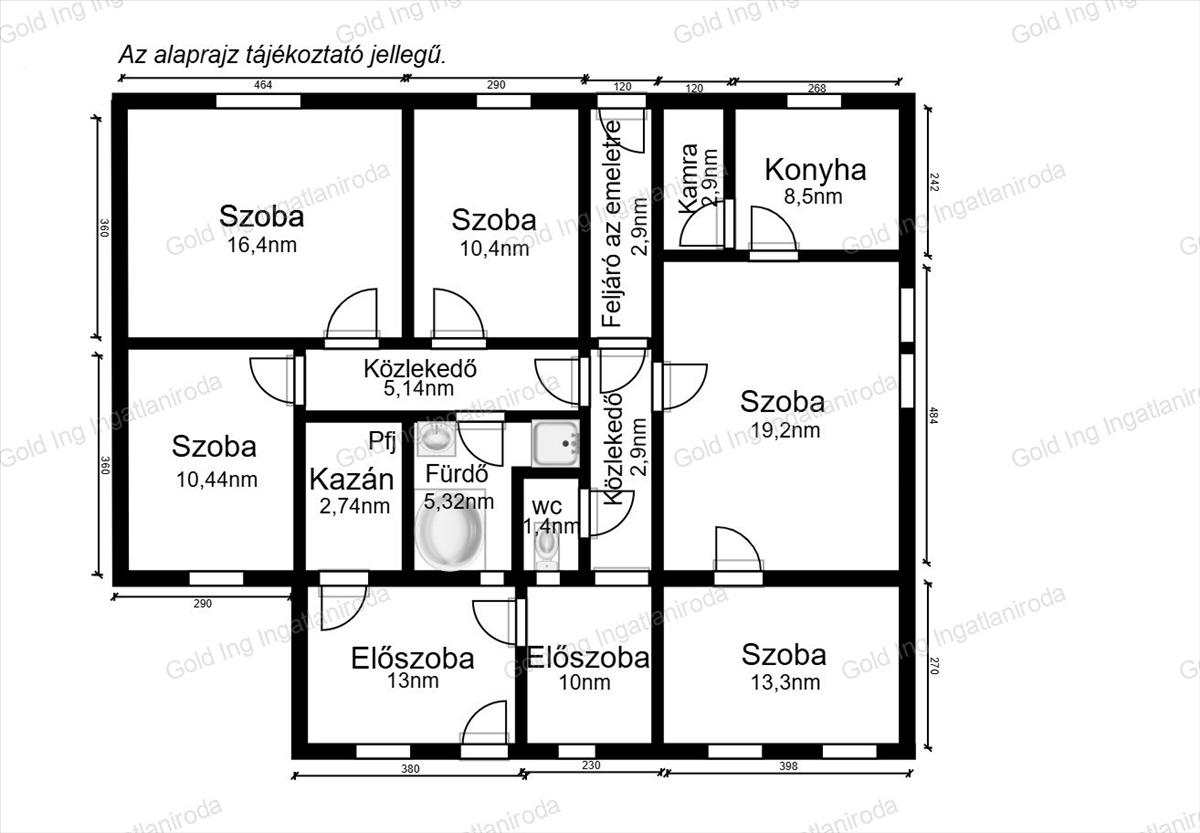 A földszint központi helyisége a tágas és világos nappali. Ebből nyílik egy praktikusan, és esztétikusan beépített, két éve felújított konyha, valamint egy több mint 11 nm-es szoba. Találhatunk lent még egy 17 nm-es hálószobát, és két több mint 11 nm-es félszobát.
