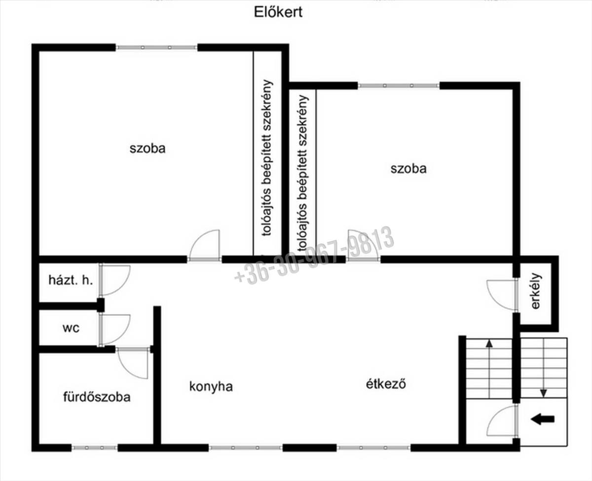 Az ingatlan helyiségei: lépcsőház, közlekedő, erkély, két külön bejáratú szoba (19 m2, 17 m2), egy légtérben lévő 18 m2-es konyha-étkező, 7 m2-es fürdőszoba (amelyben kád és tusoló is található), külön helyiségben lévő wc, háztartási helyiség ahol az automata mosógép, szárító és a kazán található.