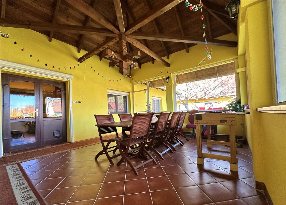 Az épület végében kialakított konyhához kapcsolódik egy téliesített, lambériázott tetőszerkezetű, bő 16 m2-es, igényes, járólappal burkolt rusztikus stílusú terasz, amit a természetes fény üvegtéglán és polikarbonát ajtón át világít meg. Mellé épült 2 db, egyenként 6 m2-es, hidegburkolatos, vendégszobának/kezelőnek/tárolónak egyéb célra használható ( egyik helyiségben ipari áram csatlakozás és lambéria burkolat került ) helyiség, a végén egy 7 m2-es apácarácsos, zárható kerékpártárolóval, aminek a tetőszerkezete létratartó rekesszel készült. Az egész házra jellemzően, az ereszdeszka, itt is kézi faragással díszített.