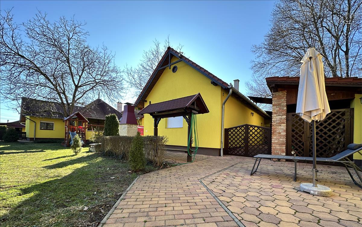 Az udvarban lévő rengeteg fa, örökzöldek, és virágok tudatosan, jóérzéssel a növények igényei szerint lettek elültetve, valódi oázist varázsolva az udvarból. a hátsó kerítés mellett a térkővel kialakításra került egy szinte mindig fényes napozóterasz, medencehellyel, ezen kívül egy betonkockákból álló szalonnasütőhely. Ha a felújított kerti grillen való sütögetésben elfáradna a ház gazdája, akkor éppen kapóra jön a mellette lévő kézi faragással díszített, tetőcserélt pihenőpad egy lélegzetnyi kis szusszanásra. Amíg a gyerekek-unokák napjait a patika állapotú csúszdás rönk játszótér és a fedett homokozó dobja fel, addig a szülők/nagyszülők élvezhetik a chillezéshez készült hinták kényelmét. Az idilli környezetet a környékbeli mókusok is nagyon kedvelik, szívesen vendégeskednek az udvarban