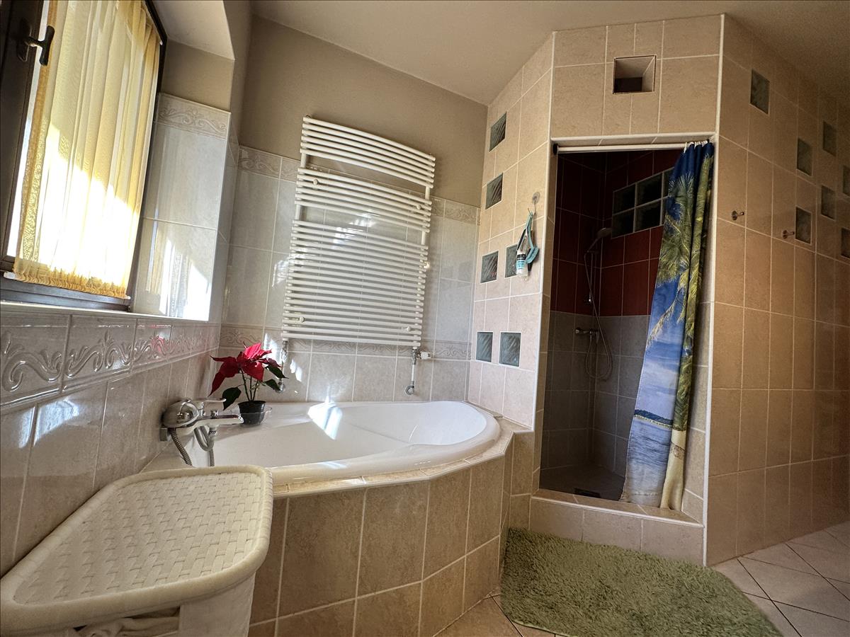 267 m2-es központi és kiegészítő épület : az ingatlan lelke szokatlanul, a telek közepére, bal szélére épült, tágas, ésszerű elrendezésű, minőségi anyaghasználat jellemzi, szépérzékkel és jóízléssel kialakítva. Szerves része a 27 m2-es fedett, parapetes kialakítású, kézi faragásokkal egyedivé varázsolt látszó tetőszerkezetű, a pollen és a rovarok ellen is védelmet nyújtó szúnyoghálóval felszerelt gyönyörű terasz is.