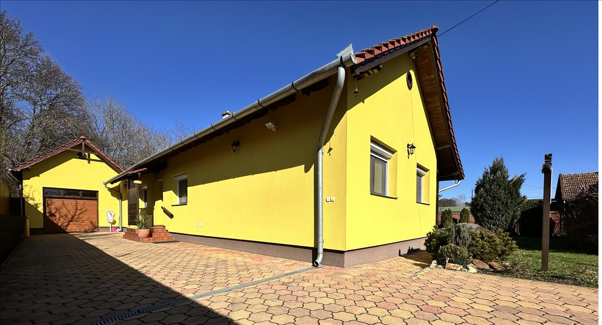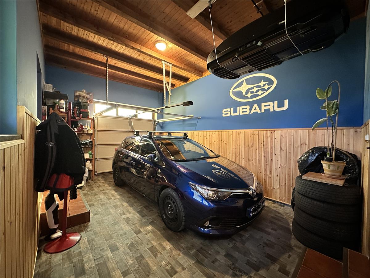 - egy új német távvezérlő nyitószerkezettel rendelkező redőny-garázskapuval kialakított, nedves időben is száraz bejárást biztosító 22, 2 m2-es garázs, amit famennyezet, falvédő lambéria és új pvc padlóborítás tesz esztétikusabbá