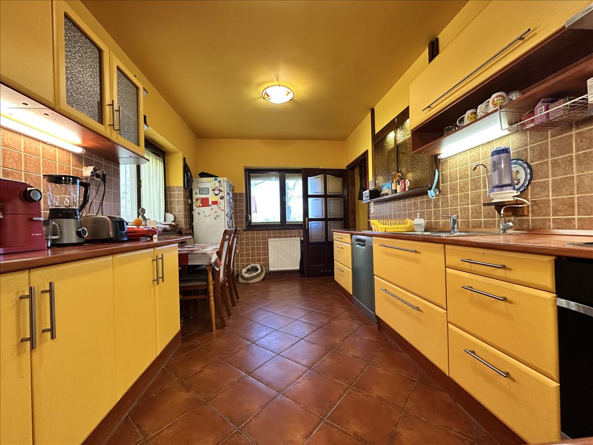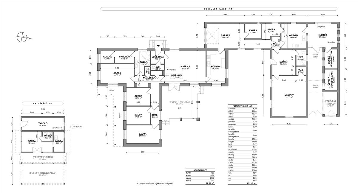 FŐÉPÜLET +kiegészítő épület : 267 m2, ami magában foglal : 6 szobát, nappali-étkezőt, 2 beépített- gépesített újszerű konyhát, 2 fürdőszobát, 3 WC-t, kamrát, óriási garázst, gardróbot, közlekedő folyosókat, 2-2 mosó és szárítógépre szerelvényezett mosókonyhát, előteret, fogadóteret, gépészeti helyiséget, előadótermet és tároló helyiséget.