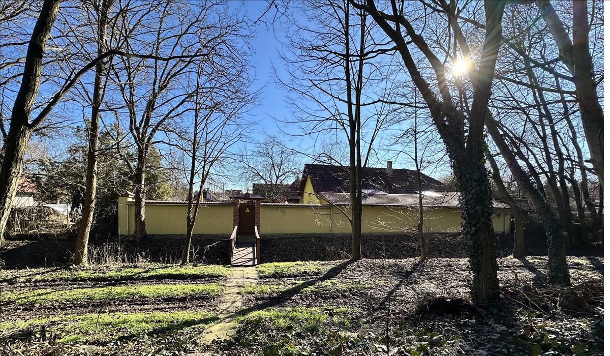 Az 1510 m2-es, szép széles, síkba hozott, feltöltött, gyakorlatilag dupla telek, 2 távvezérlős elektromos kapun át járható be, minden oldalán újszerű kerítéssel határolt. Utcafrontja előtt akár 5-6 autó számára is elegendő, beton törmelékkel és geotextillel ágyazott, zúzott kővel feltöltött parkolóöböl helyezkedik el, az újszerű kézi faragású székelykapu elé és szerte az épületek körül 2 ütemben, több mint 300 m2, szakszerűen – süllyedésmentesen lefektetett szegélyezett térkő burkolat van. a kerítés jobb oldalán teljesen új, masszív beton alapozással, famintás lindab lemezkerítés került, új hörmann típusú kapunyitó szerkezettel. a telek szélső oldalait szintén újszerű lindab lemezkerítés határolja, míg a hátsó részen, beton alapozással egy masszív, vízelvezetéssel, kavicsággyal épült téglakerítés található, kovácsolt vas - fa kiskapuval. a kerítések a kíváncsi tekintetek elől tökéletesen védetté teszik a privát életteret. a kiskapun egy szép állapotú, karban tartott kis fahídon át a szép ősfás környezetben lévő élővíz csatorna partja csupán pár lépésre van. Száraz időben a Feketefenyő utca irányából az autós bejárás is lehetséges, igény esetén akár parkoló is kialakítható.